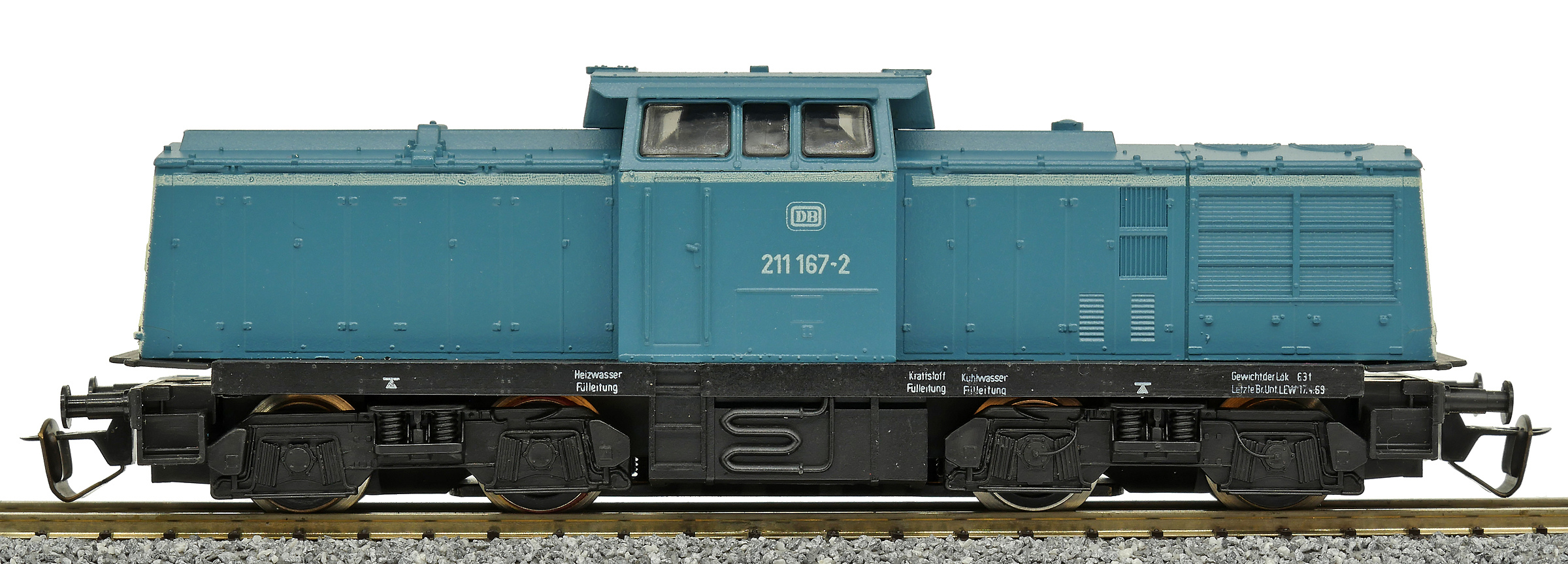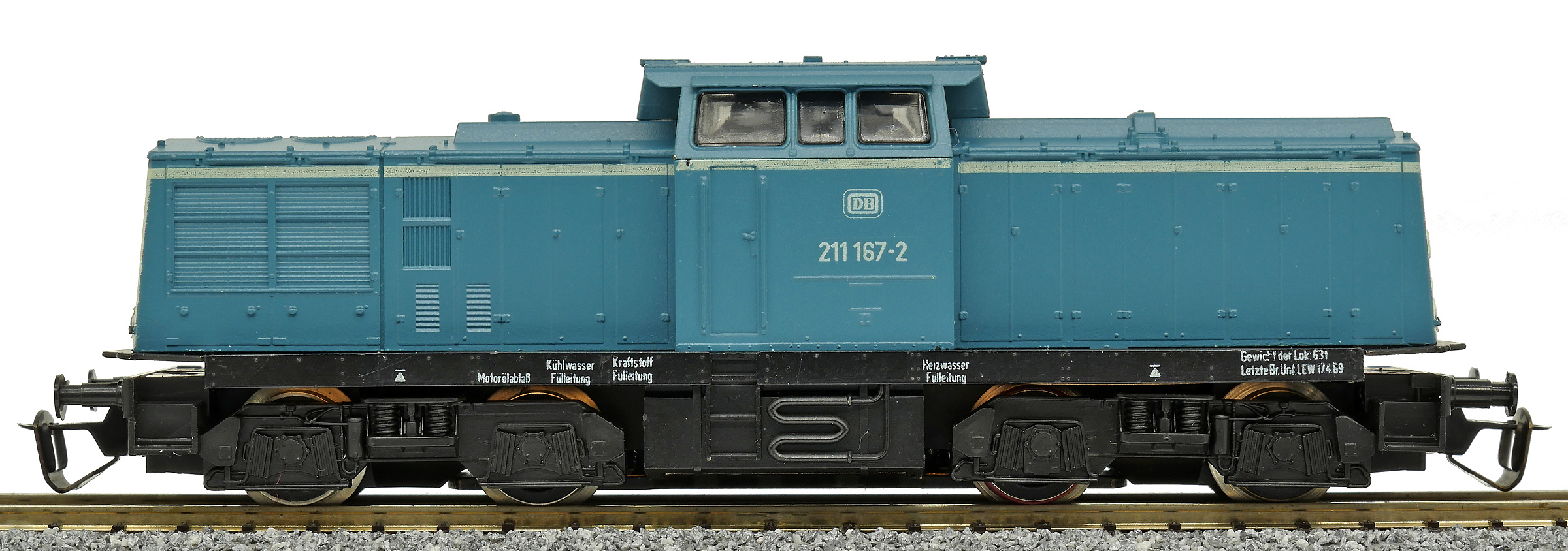 | dieselová lokomotiva modrá s bílým čelem, černý rám a pojezd |