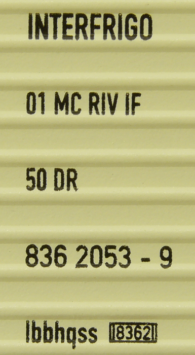 | • Ibbhqss | - | vůz s regulovanou teplotou, chladící vůz s tepelnou izolací třídy IN, s výměnou vzduchu pomocí větračů, s podlahovým roštem a schránami na led (3,5 m3 nebo více) |