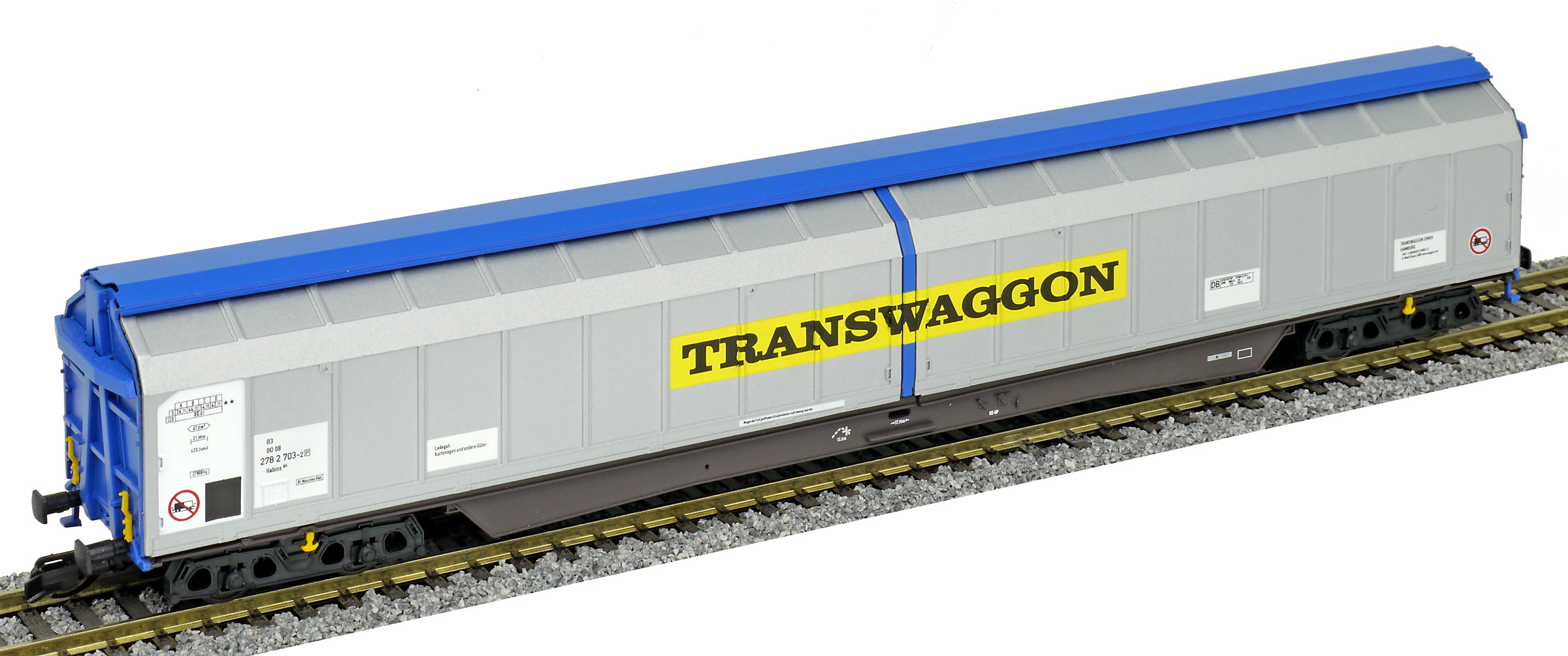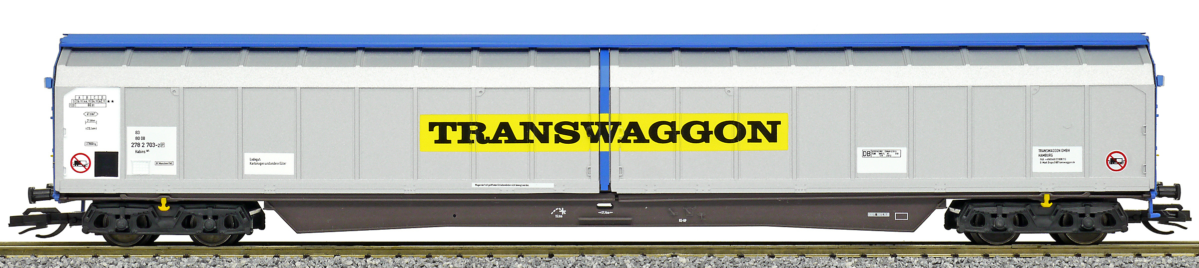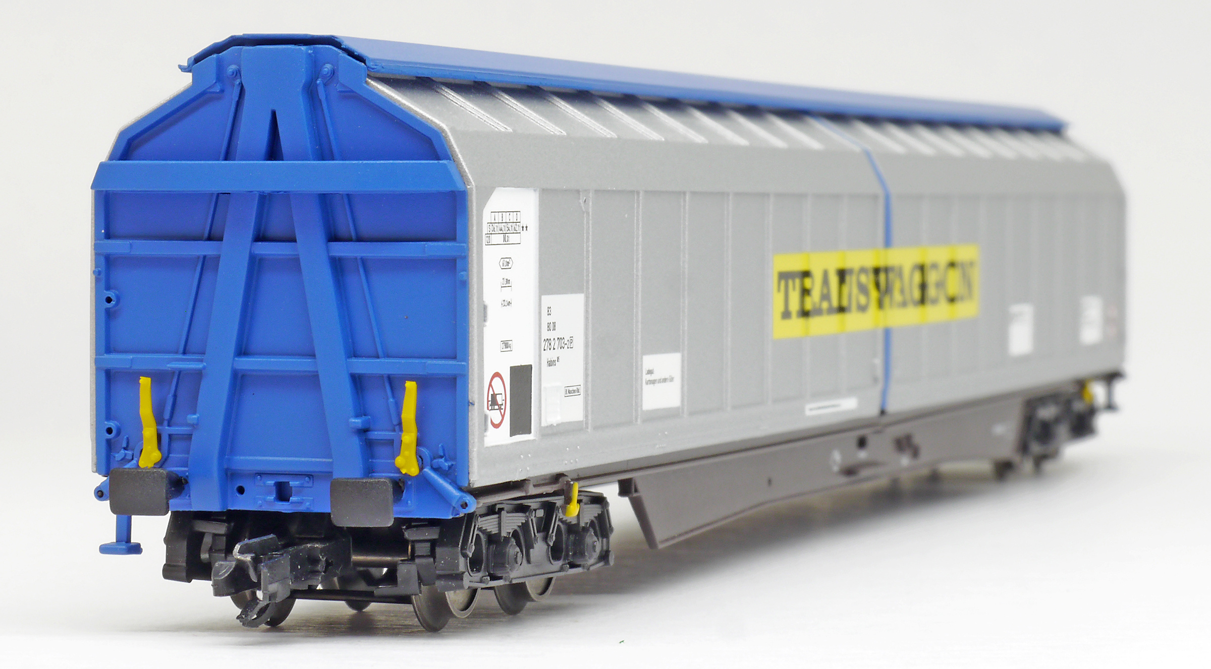 | krytý nákladní vůz modrý se stříbrnými bočnicemi „Transwaggon“ |