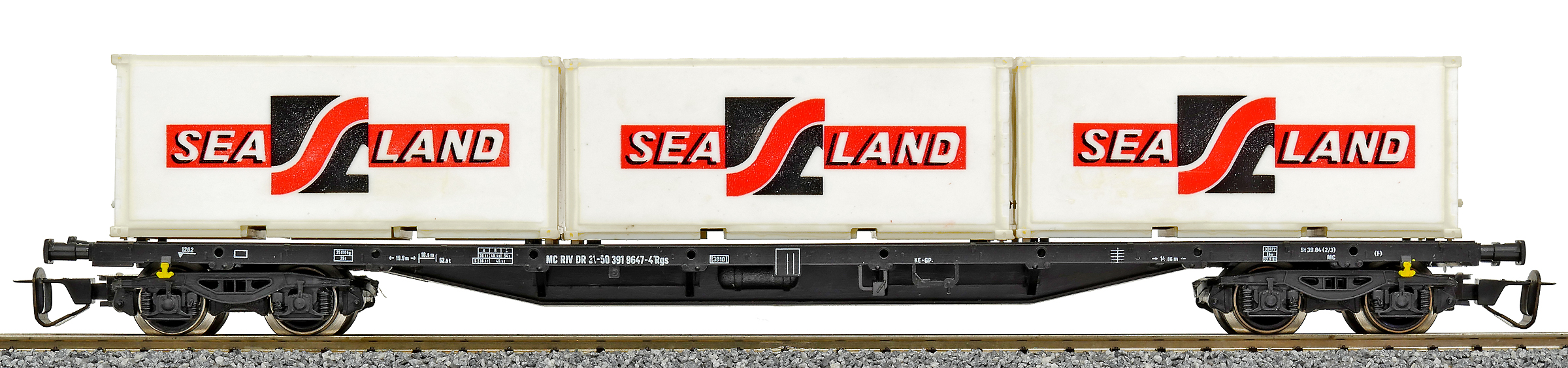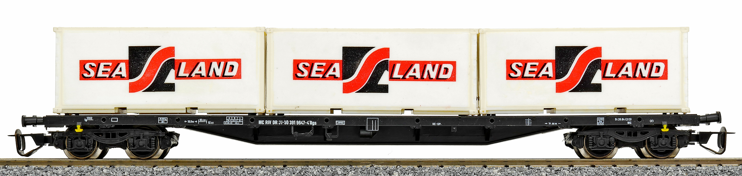 | nákladní plošinový vůz černý se třemi kontejnery 20' „SEA LAND“ |