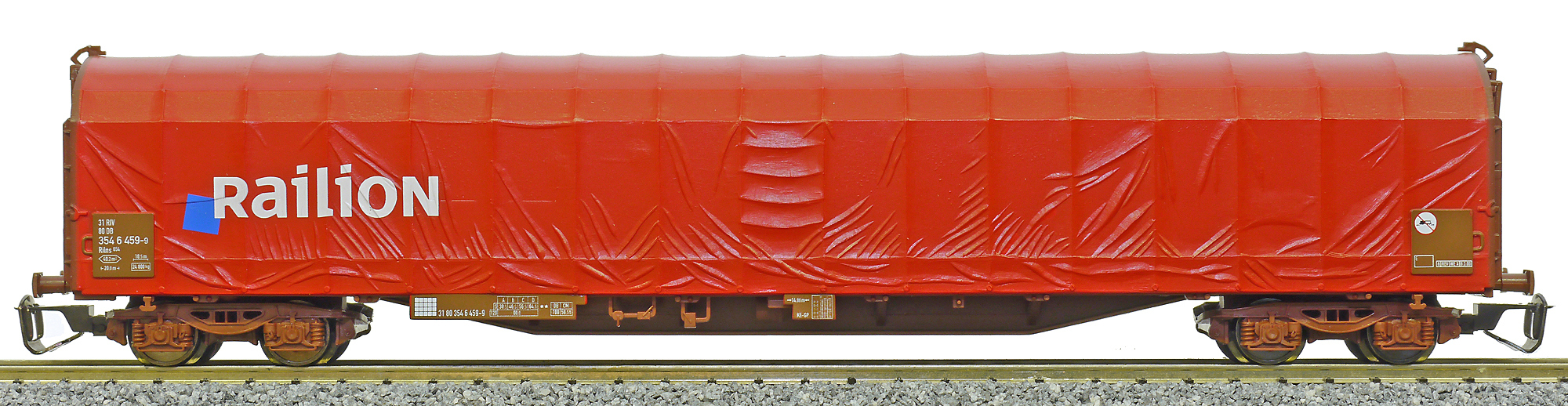 | nákladní vůz s posuvnou plachtou červenohnědý, červená plachta „Raillion“ |