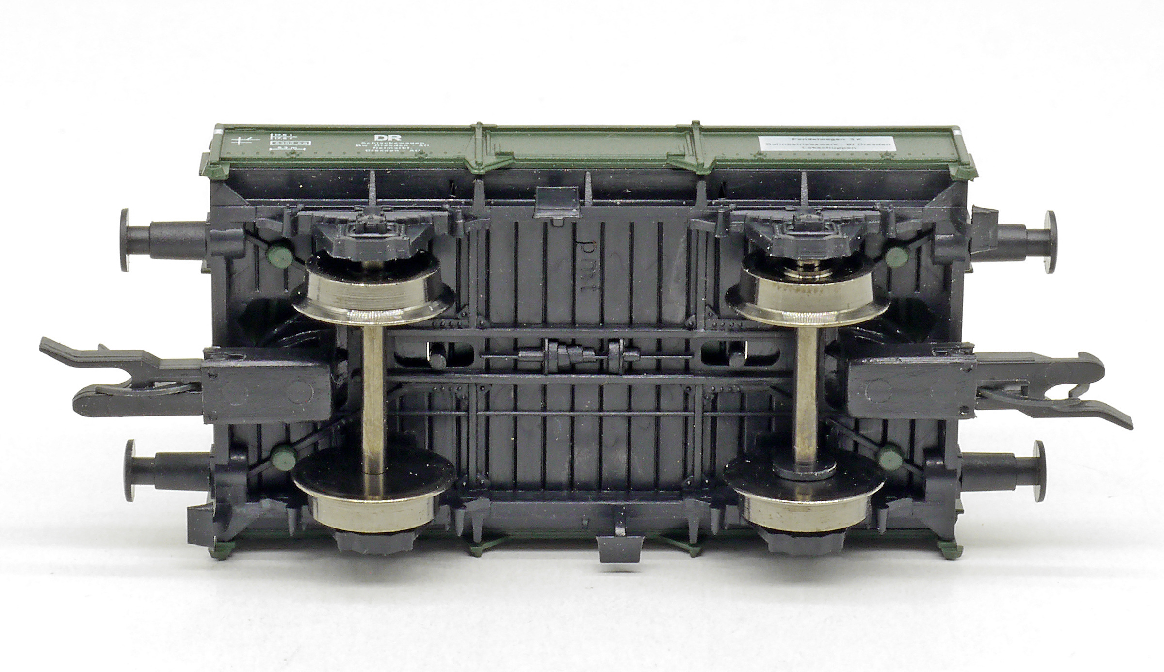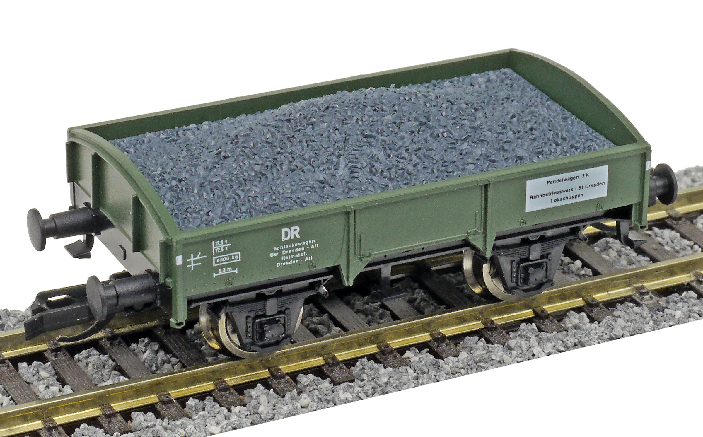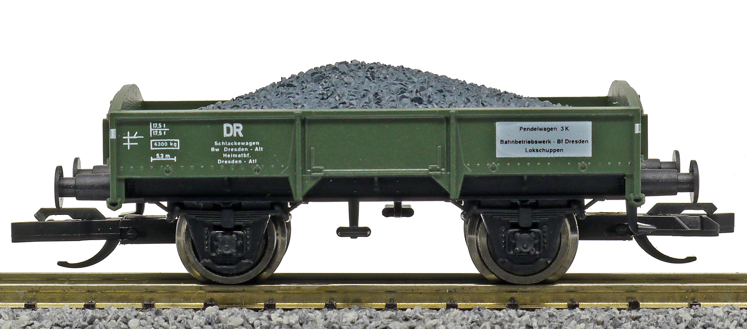 Popis   nízkostěnný nákladní vůz tmavě zelený, černý pojezd, s nákladem strusky