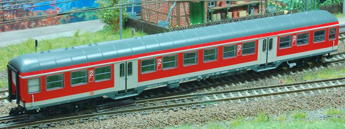 | osobní vůz červený s bílými proužky a dveřmi a s šedou střechou 2. tř. |