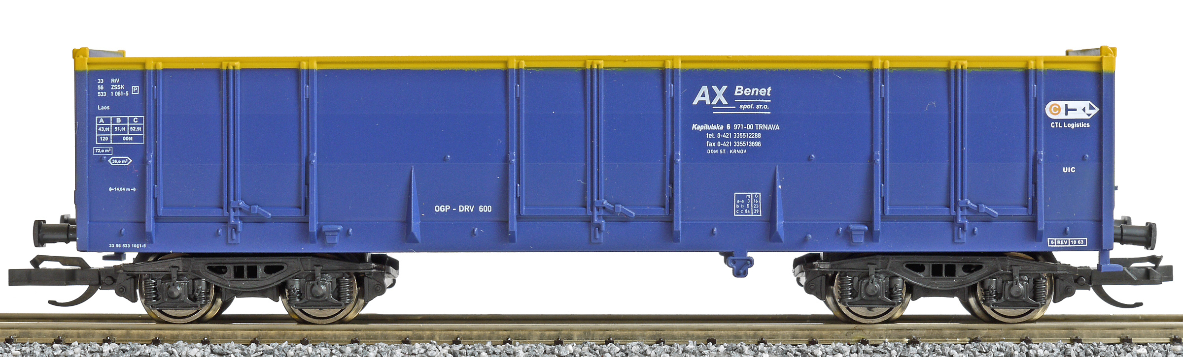 měřítko 1:120 - rozchod kolejí 12 mm kinematika krátkého spřáhla (KKK) podle normy NEM 358 355 mm - celková délka modelu přes nárazníky 4+4+4 - celkový počet náprav nebo rozložení náprav