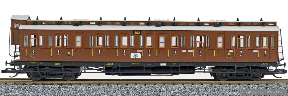 | oddílový osobní vůz červenohnědý se světle šedou střechou 3. tř. |