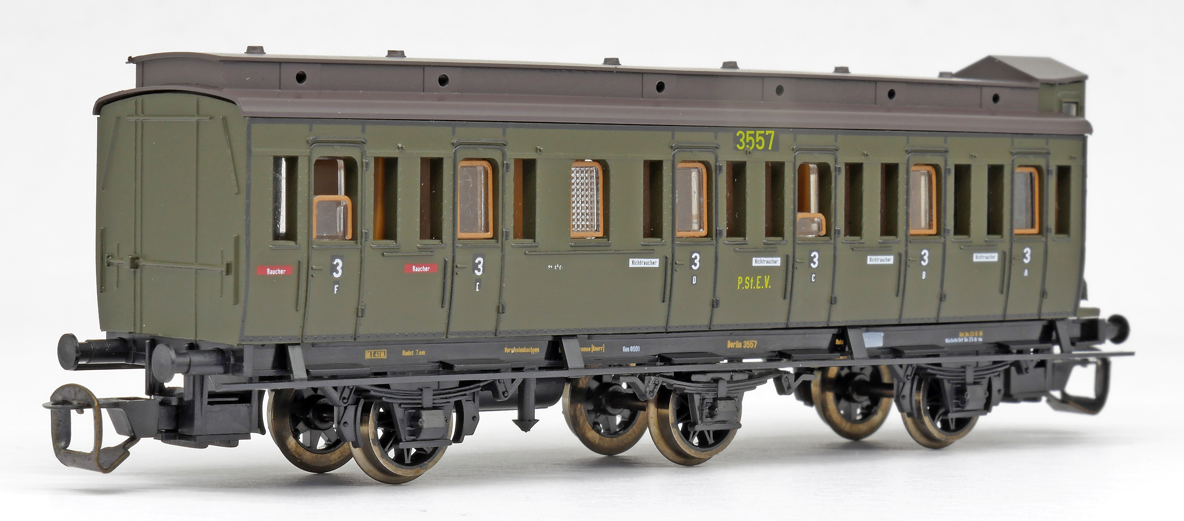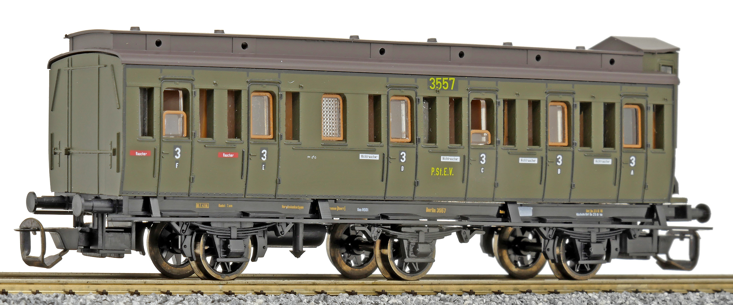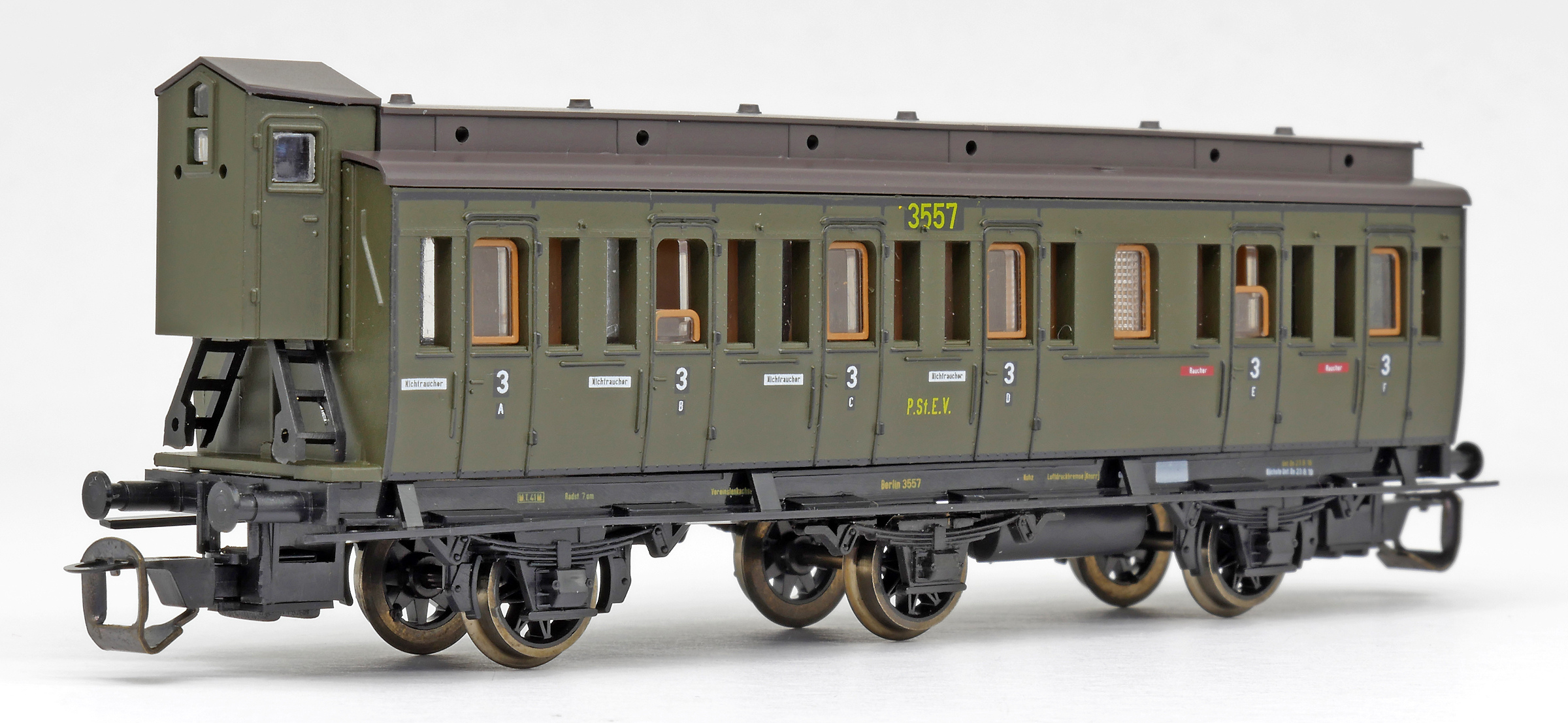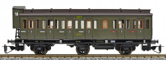 Popis   oddílový osobní vůz zelený s černou střechou s brzdařskou budkou 3. tř. C3 pr 11