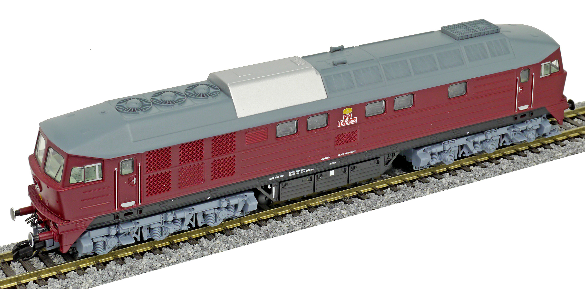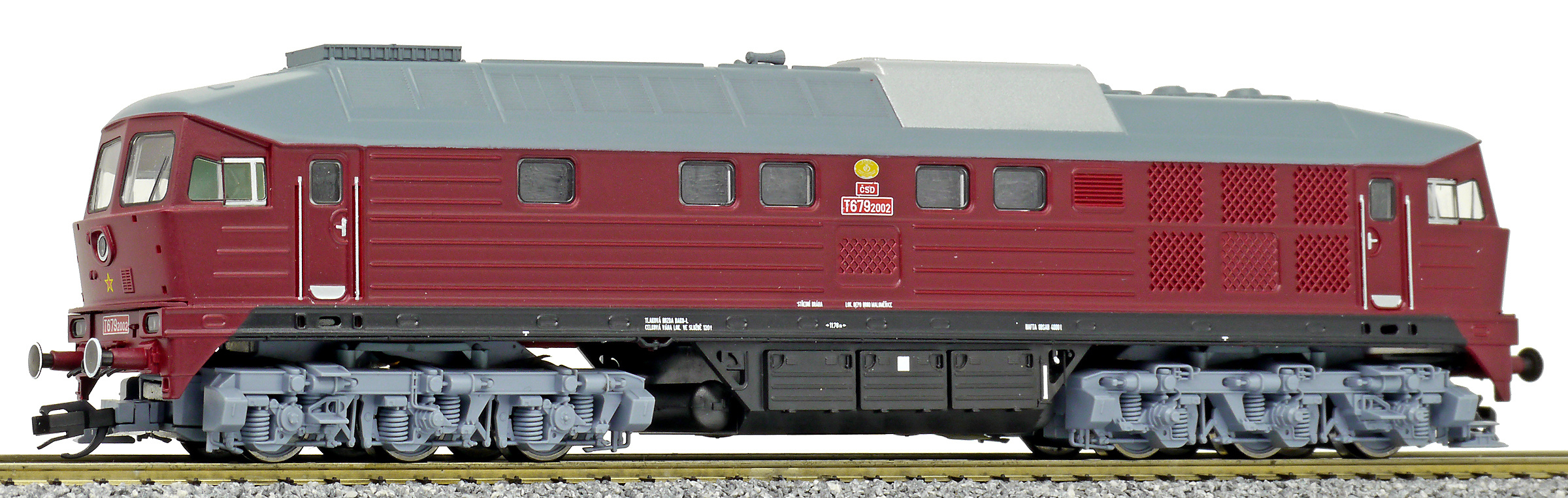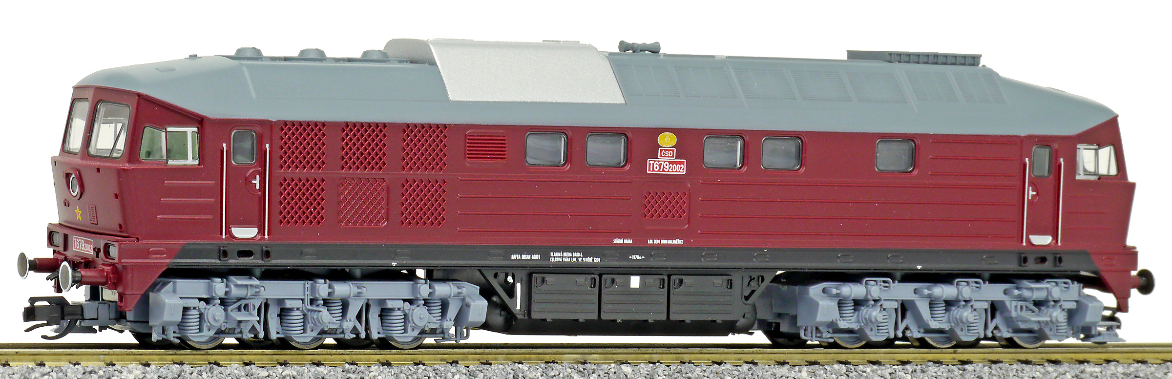 | dieselová lokomotiva červenohnědá s tmavě šedou střechou a podvozky |