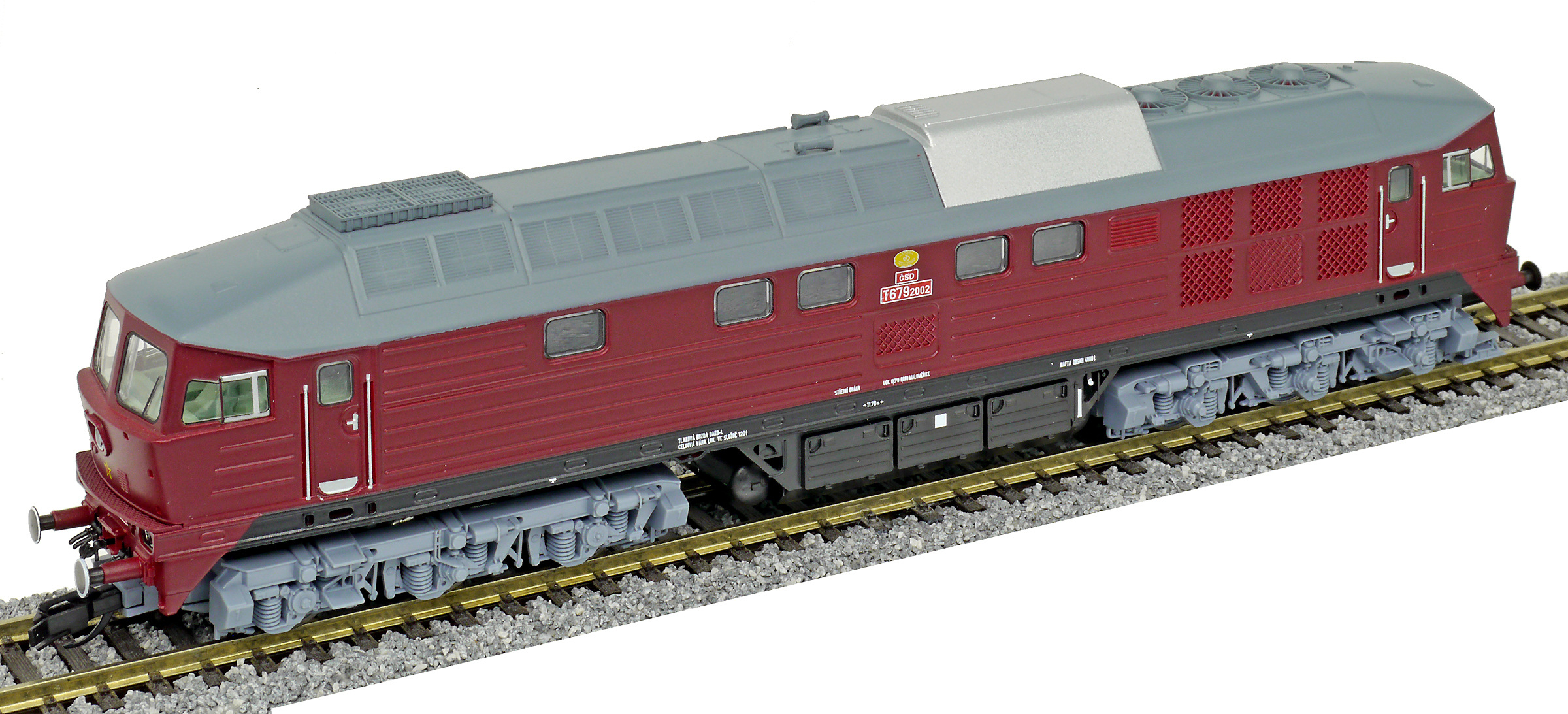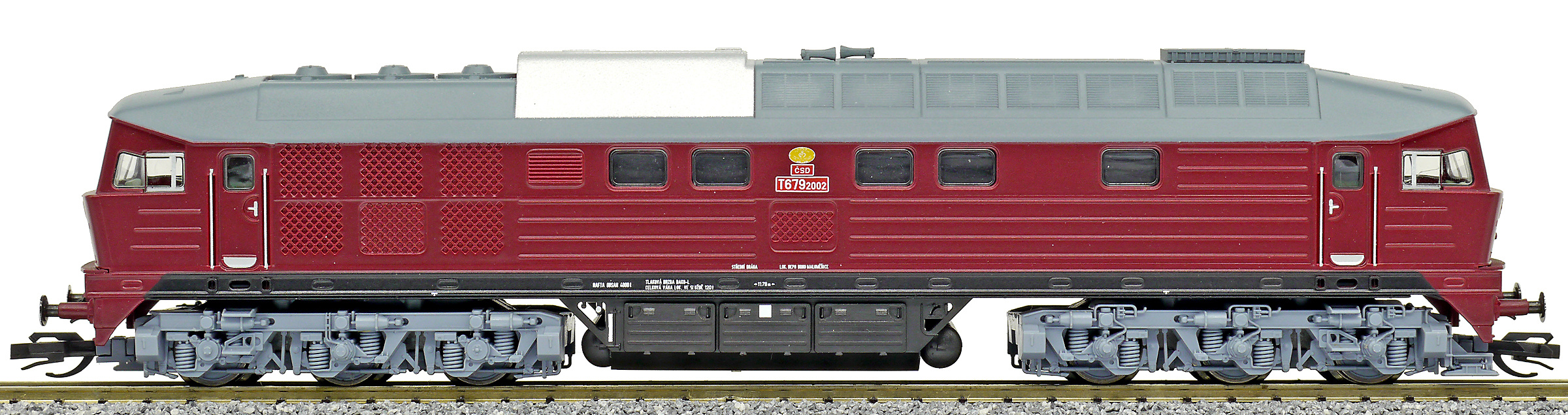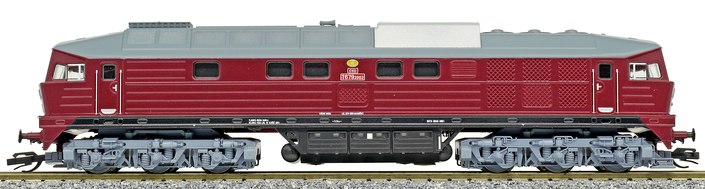| dieselová lokomotiva červenohnědá s tmavě šedou střechou a podvozky |