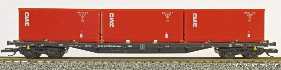 | nákladní plošinový vůz černý se třemi kontejnery 20' „DSR“ |