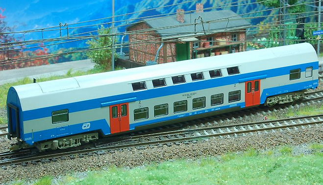 | středový patrový vůz modrý-bílý s oranžovými dveřmi |