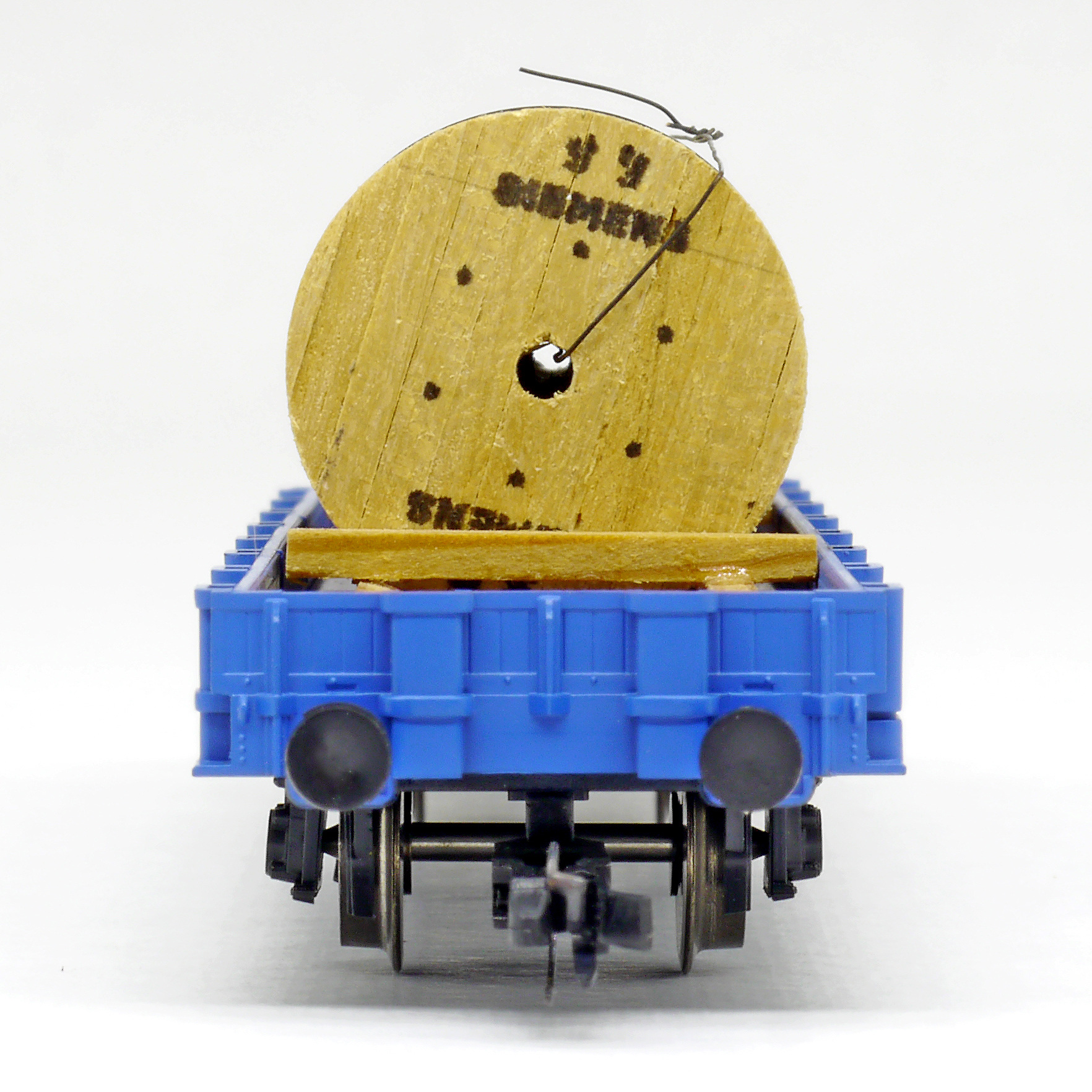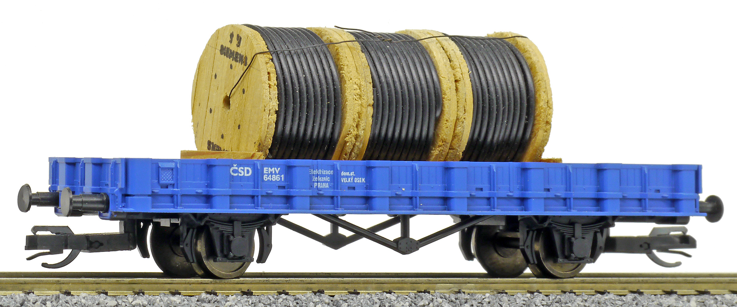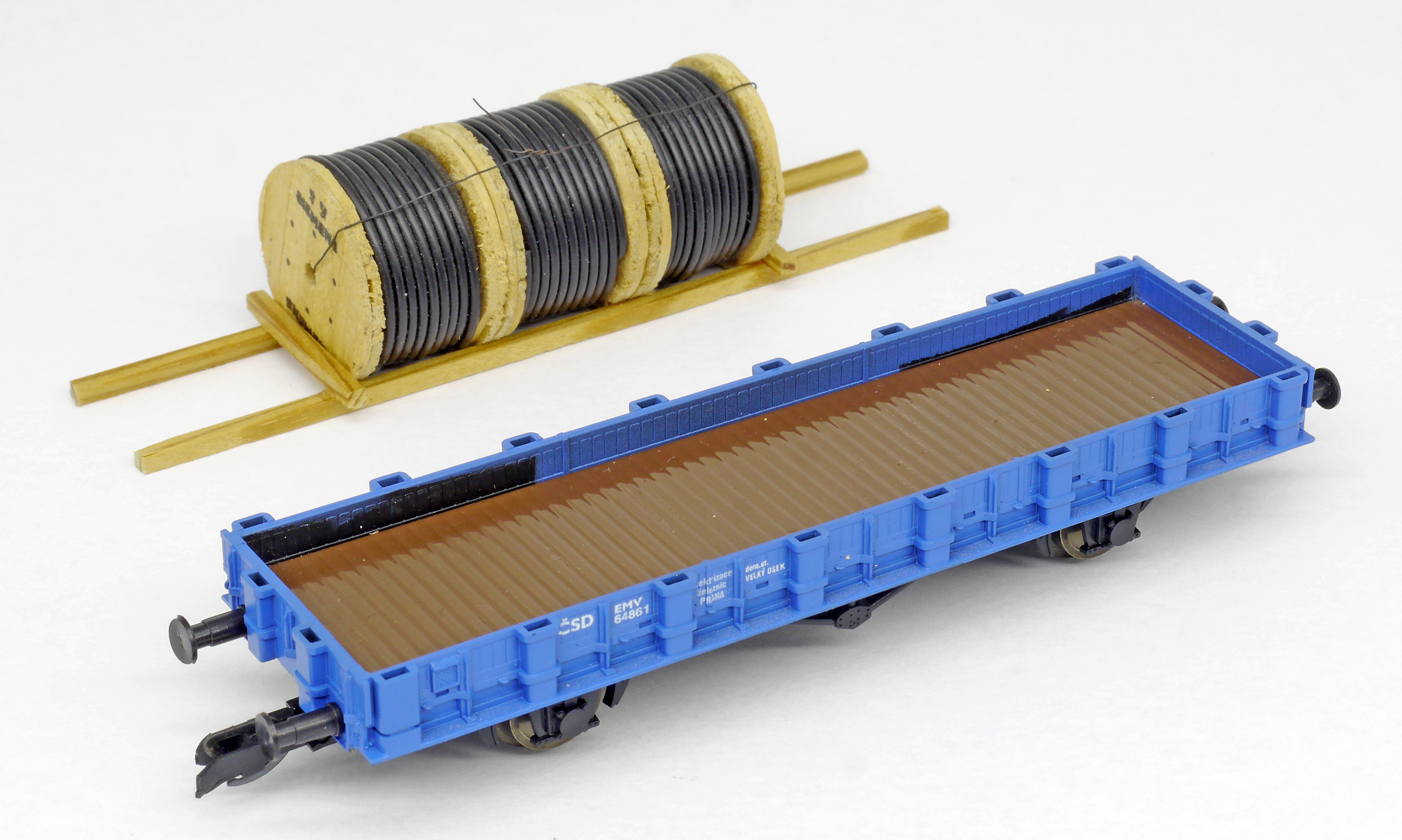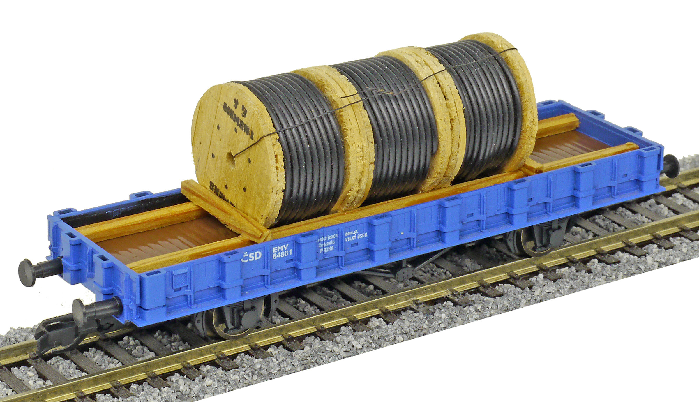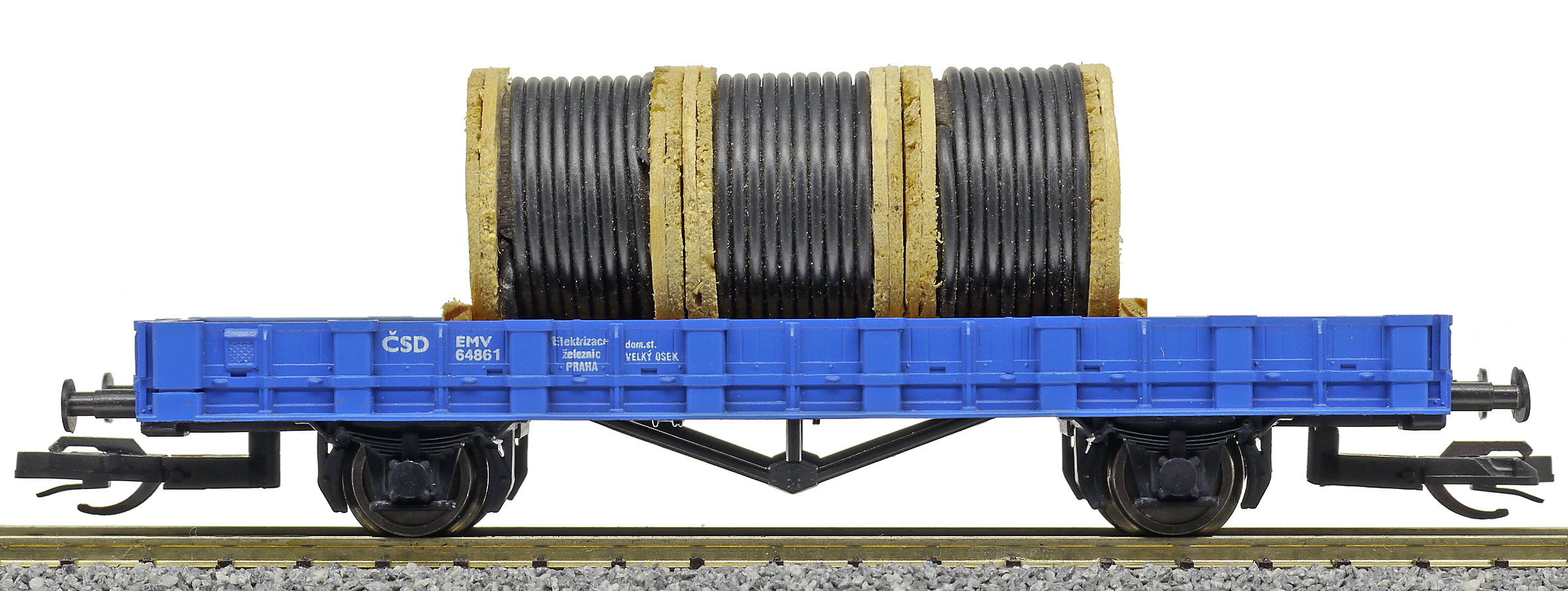 | nízkostěnný nákladní vůz modrý s nákladem tří bubnů kabelů „Elektrizace železnic“ |