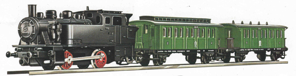 | set parní lokomotivy a dvou osobních vozů pruského typu |