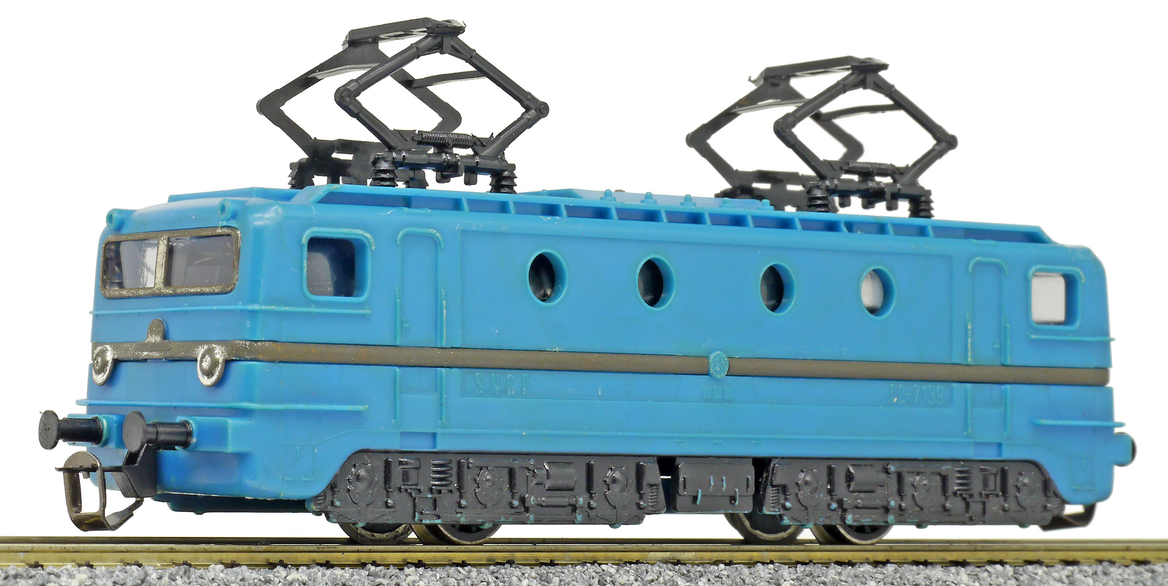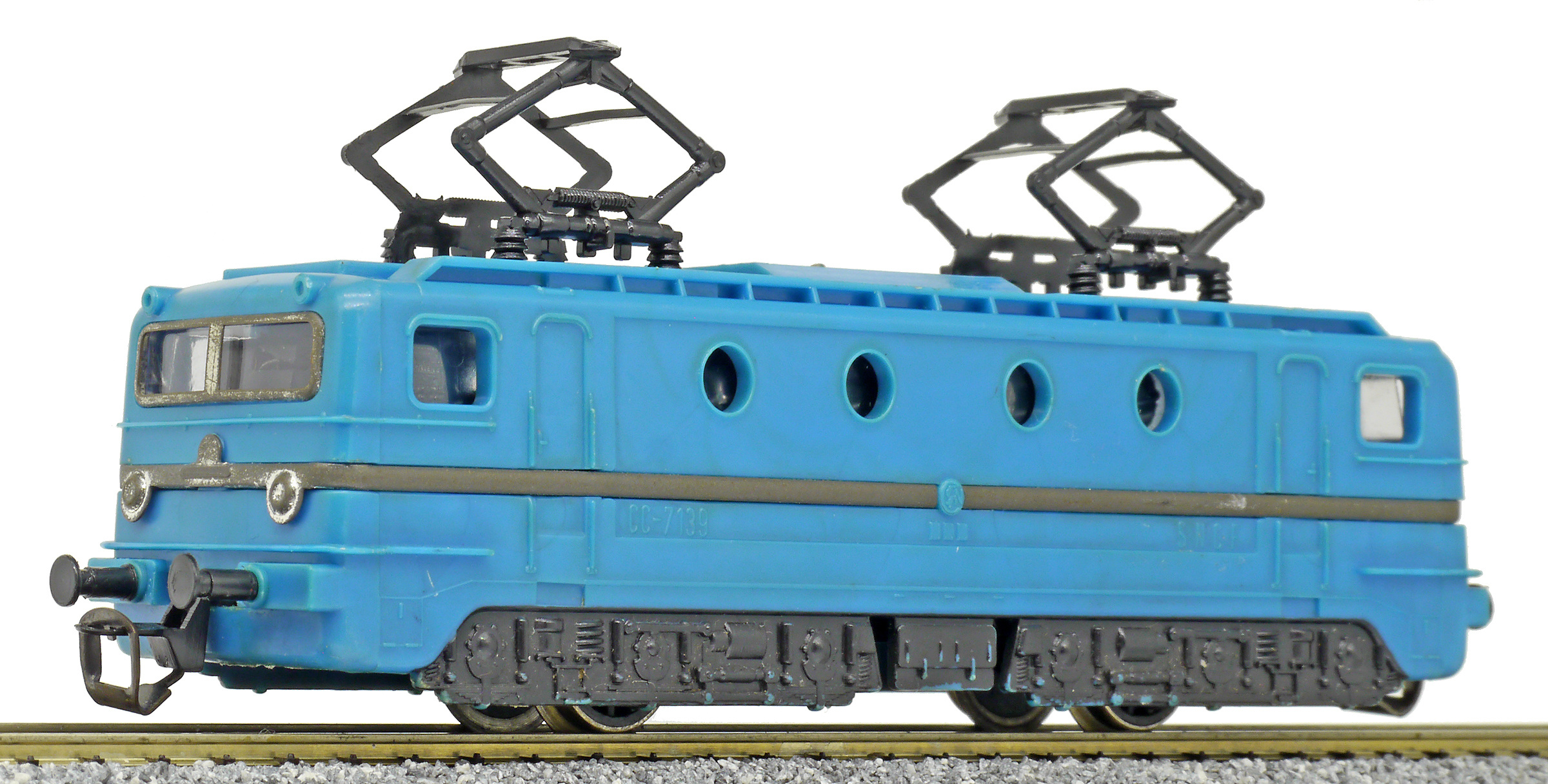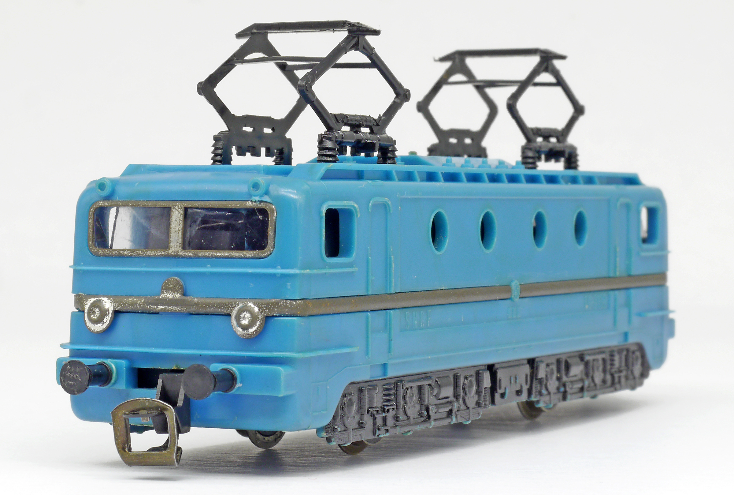 | elektrická lokomotiva, různé barvy plastu, černé plastové pantografy a černá imitace pojezdu |