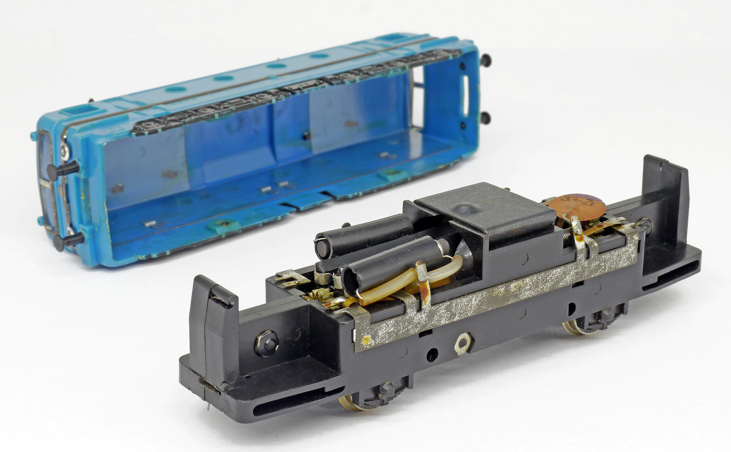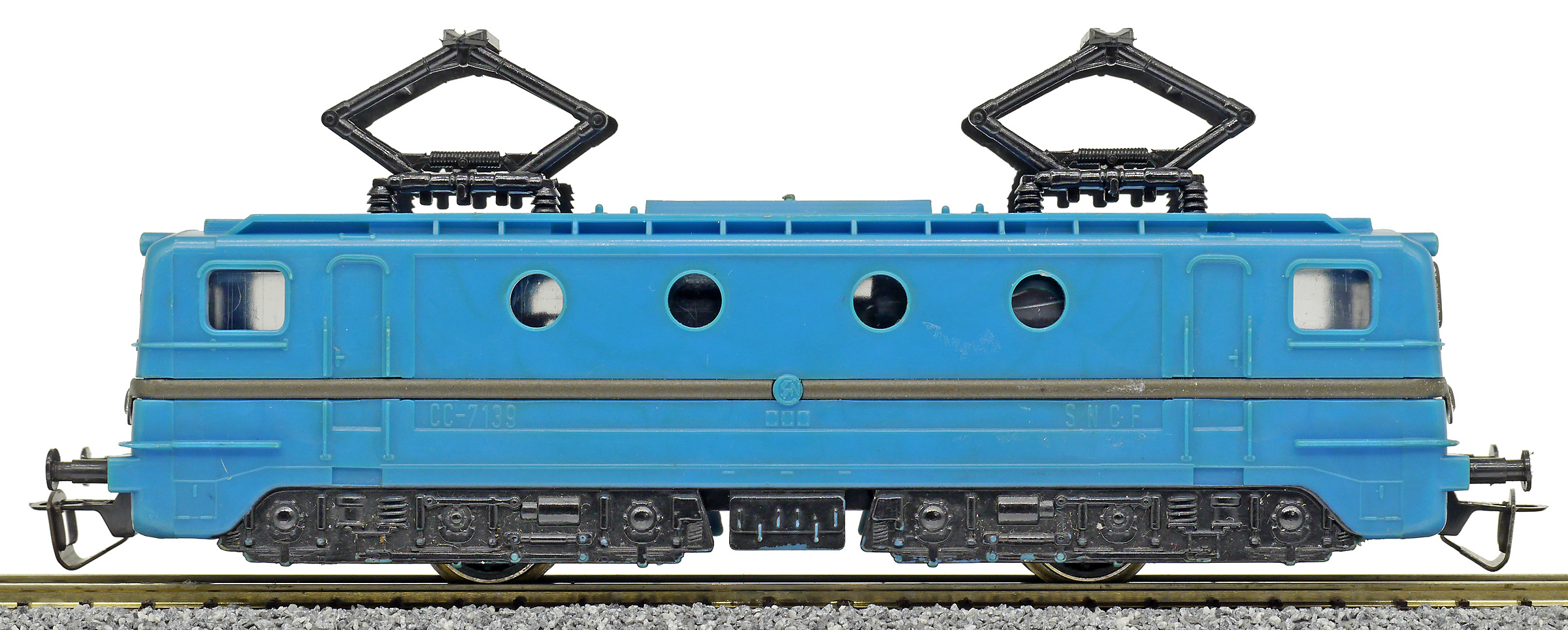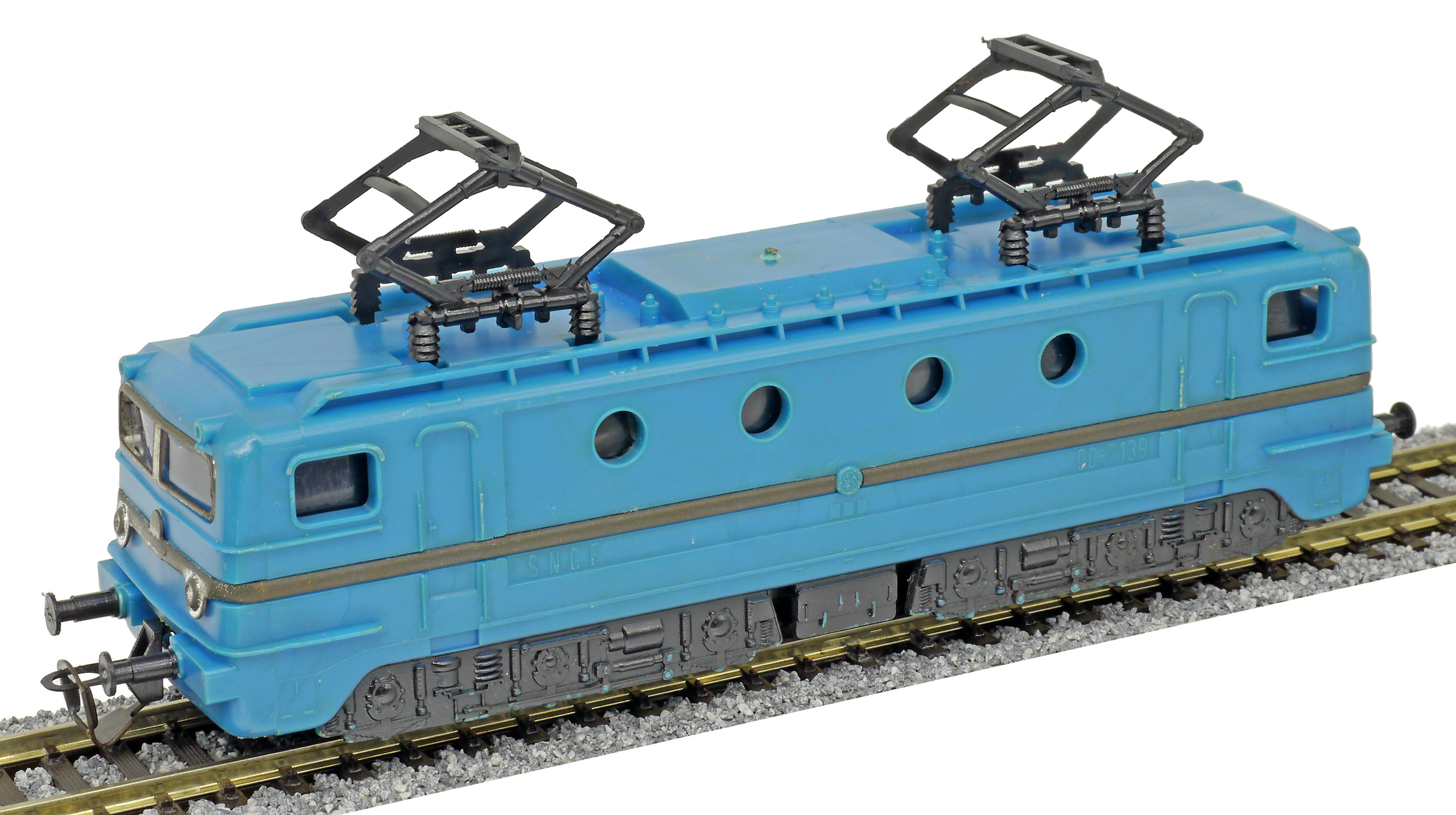 | elektrická lokomotiva, různé barvy plastu, černé plastové pantografy a černá imitace pojezdu |