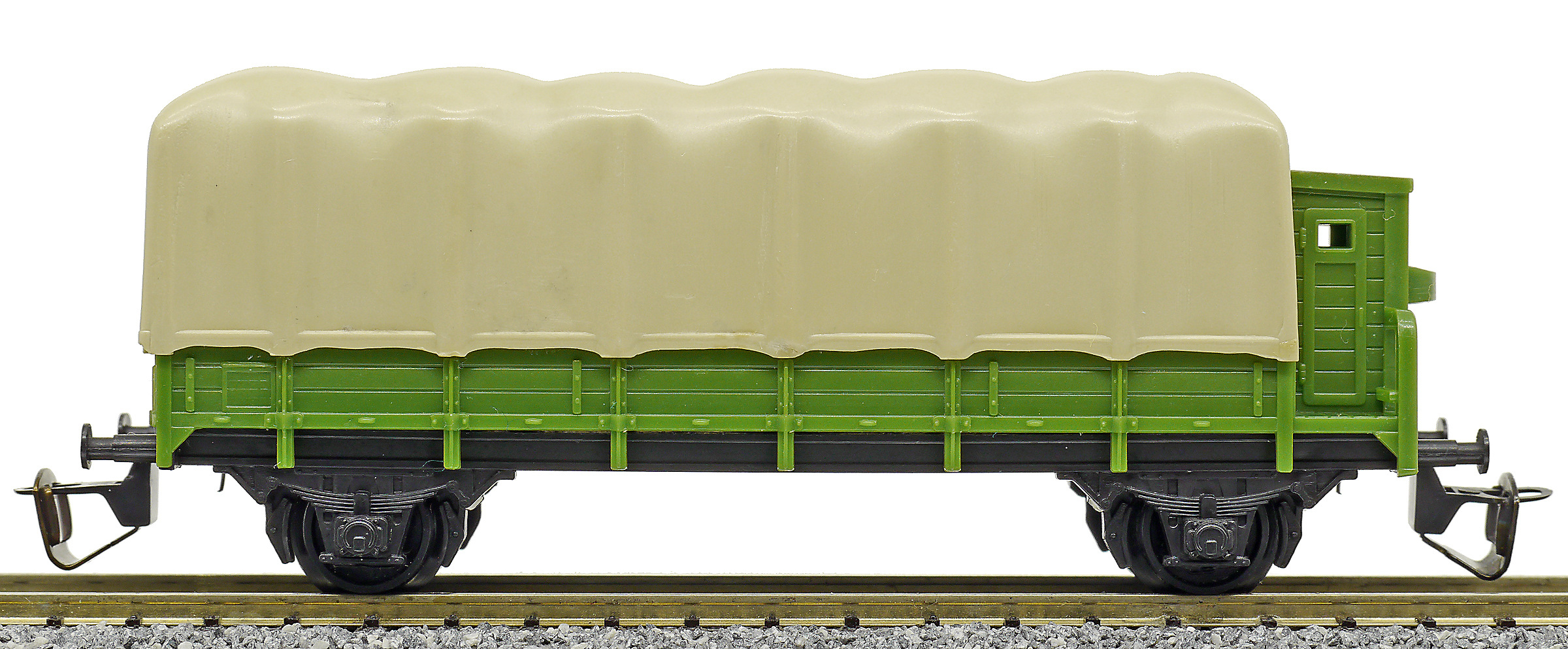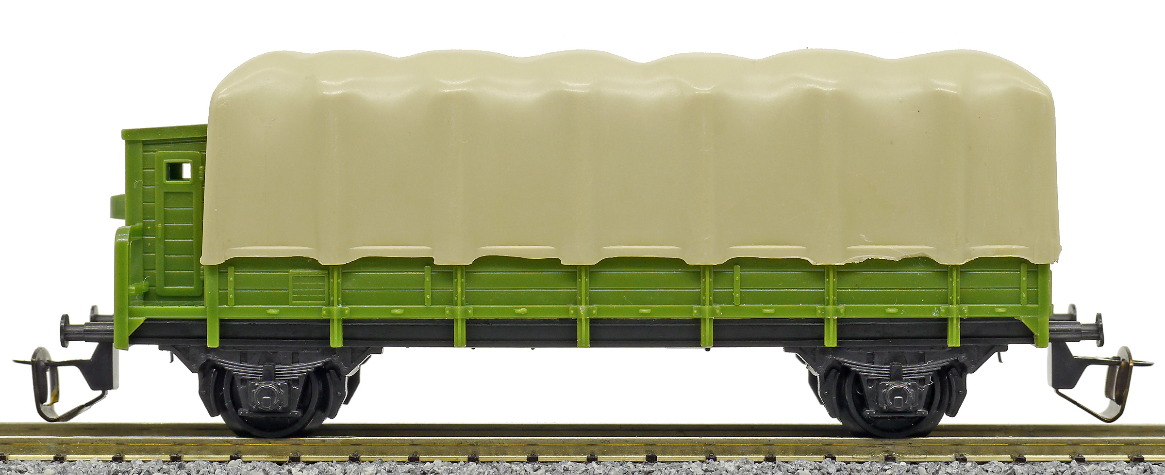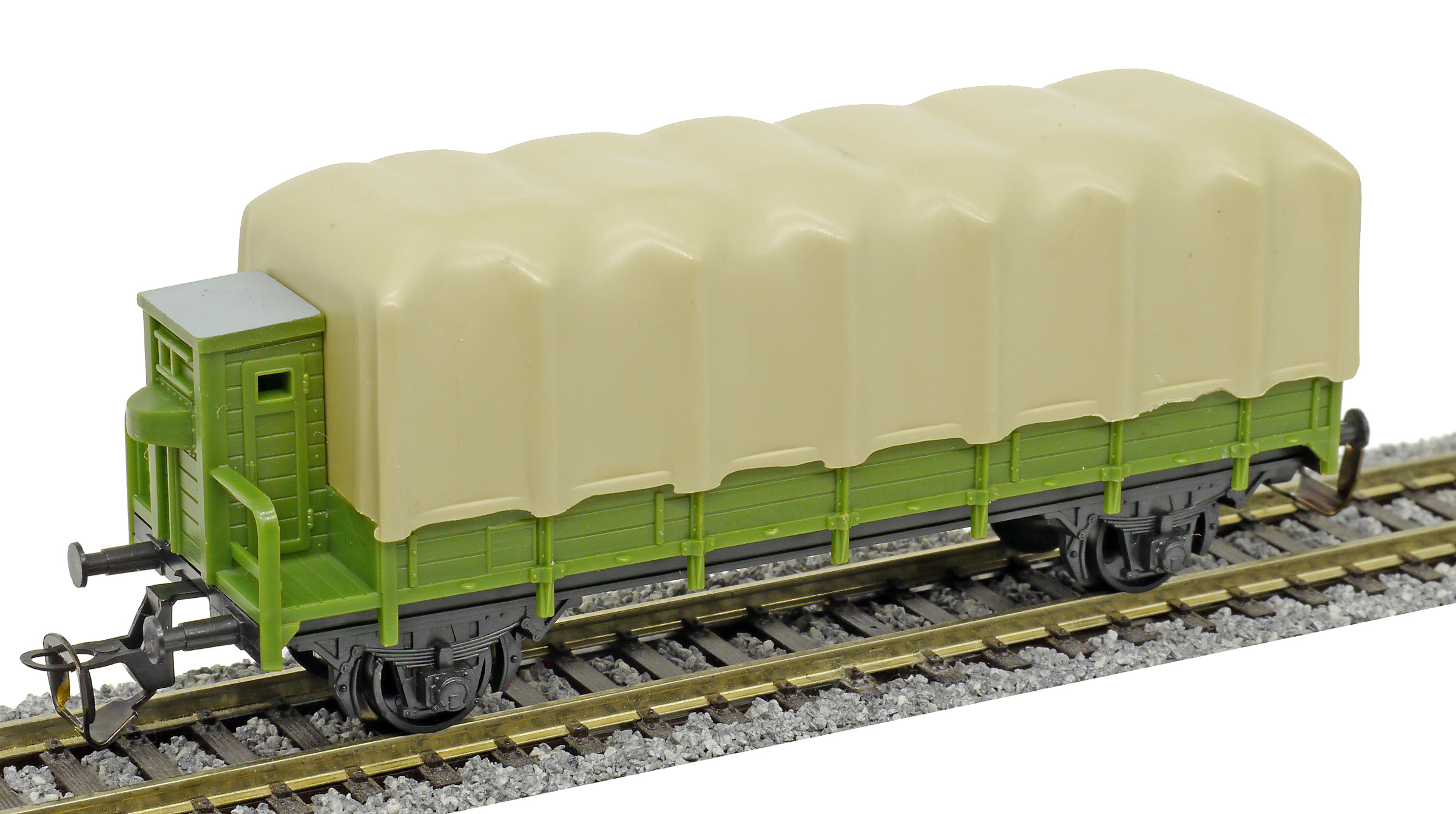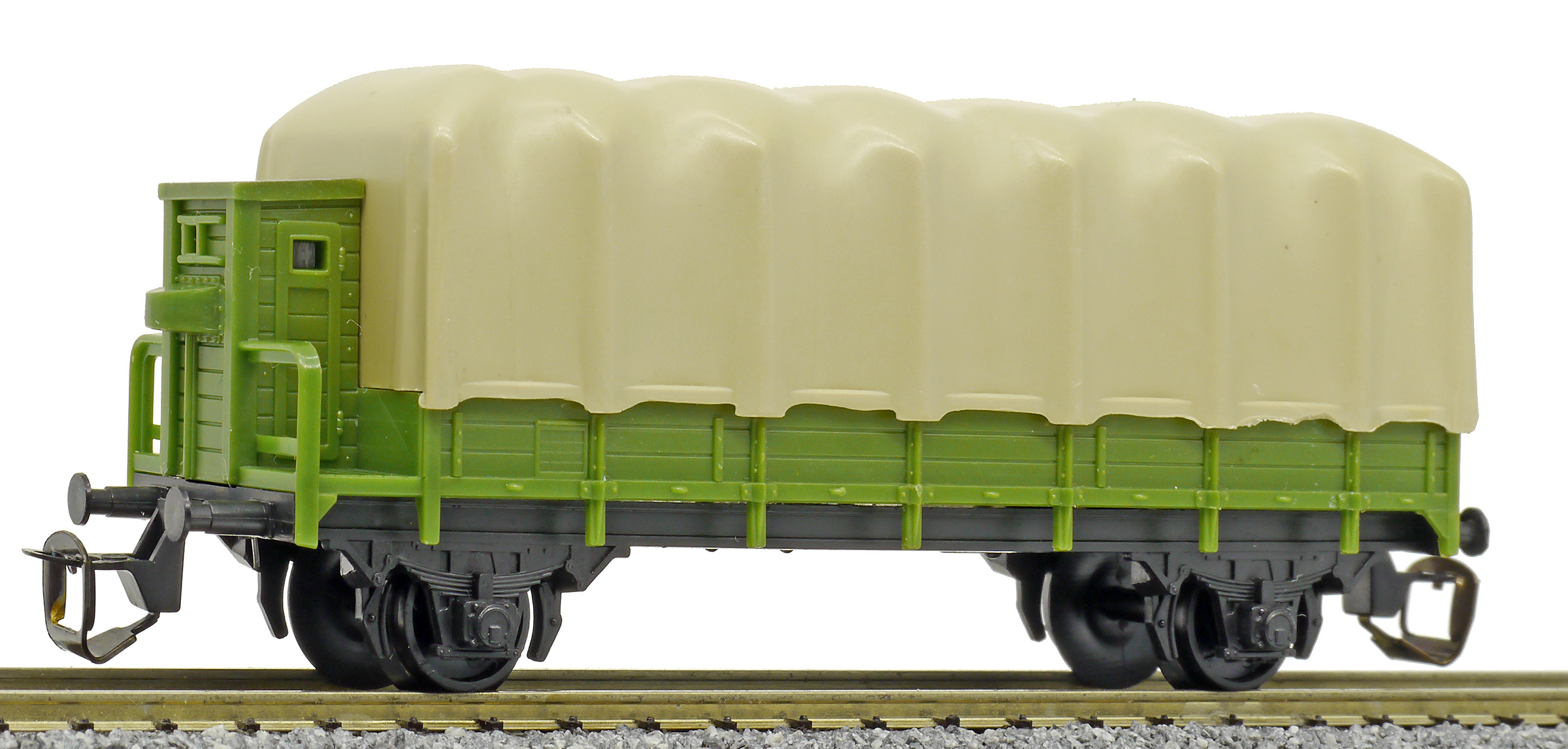 | nízkostěnný nákladní vůz zelený s brzdařskou budkou a s plachou |