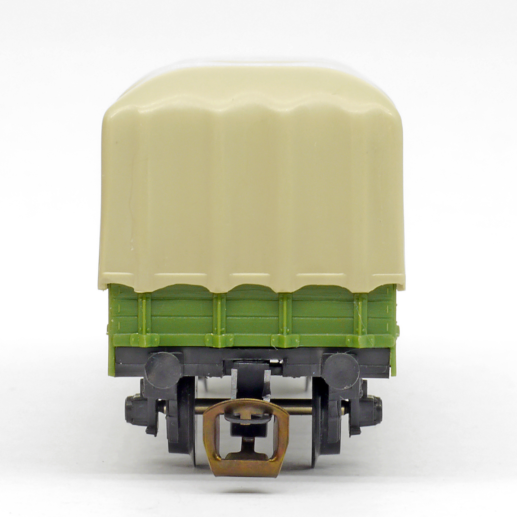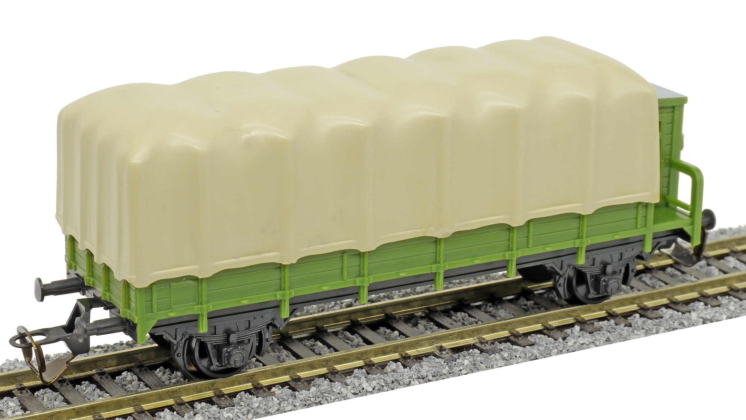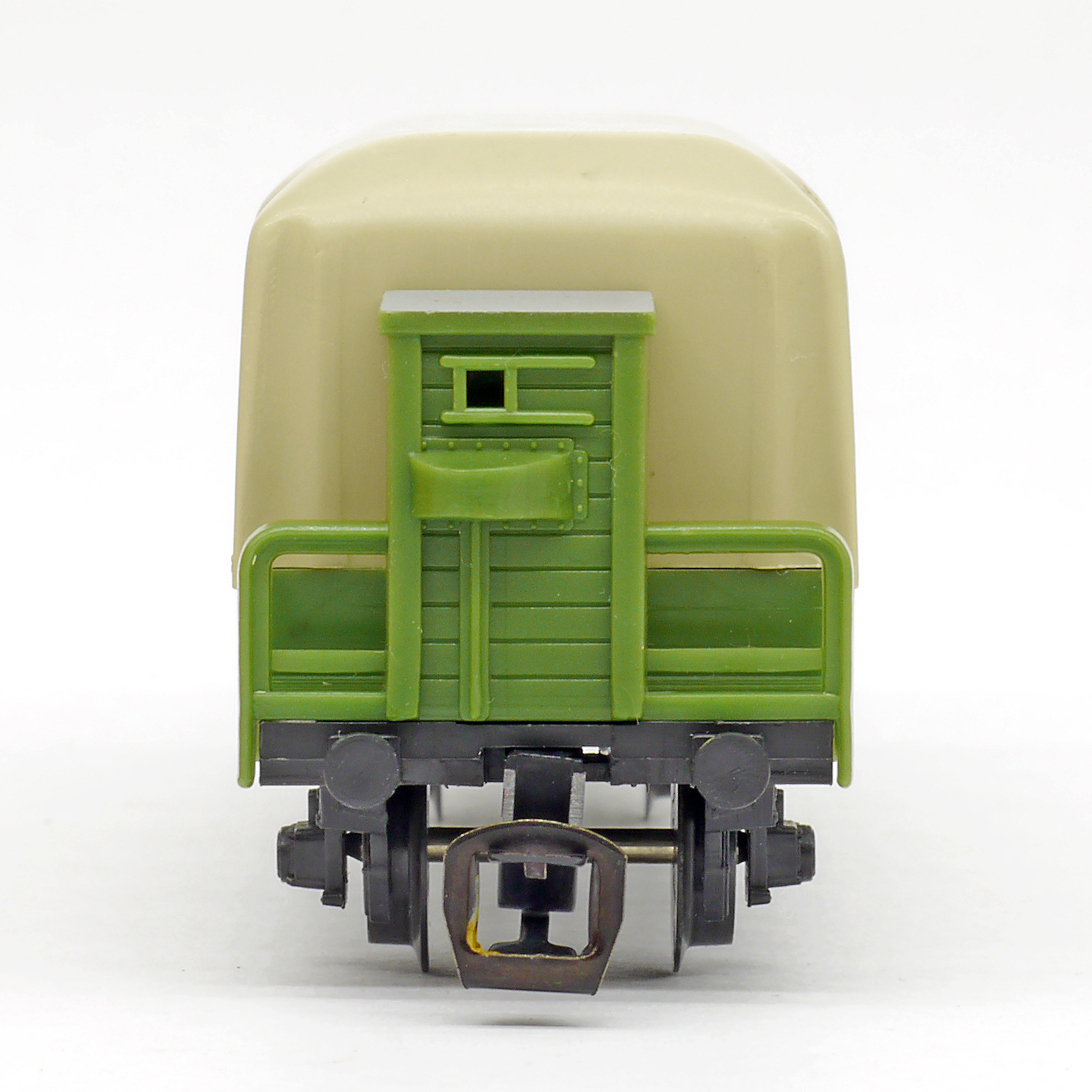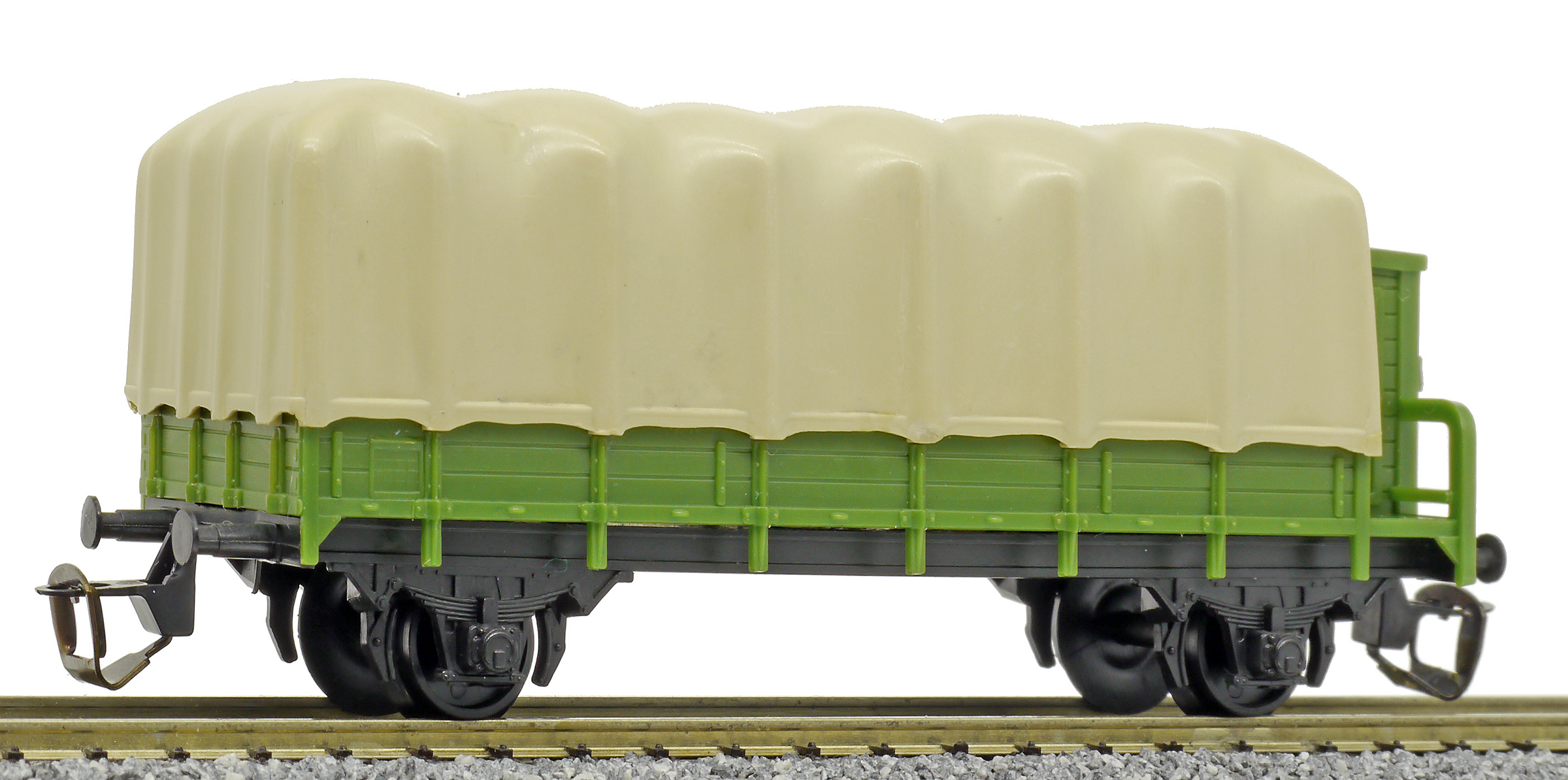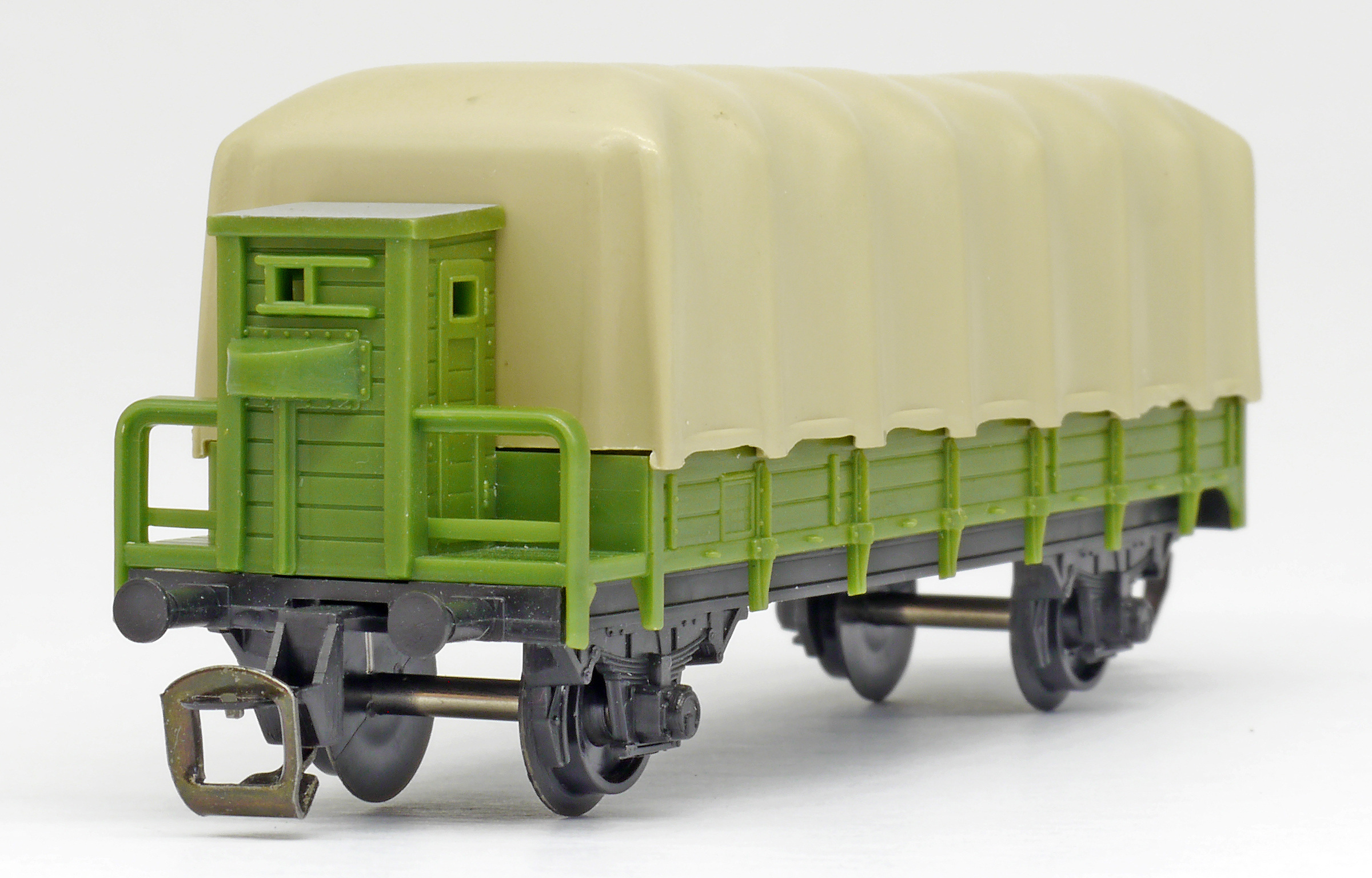 | nízkostěnný nákladní vůz zelený s brzdařskou budkou a s plachou |