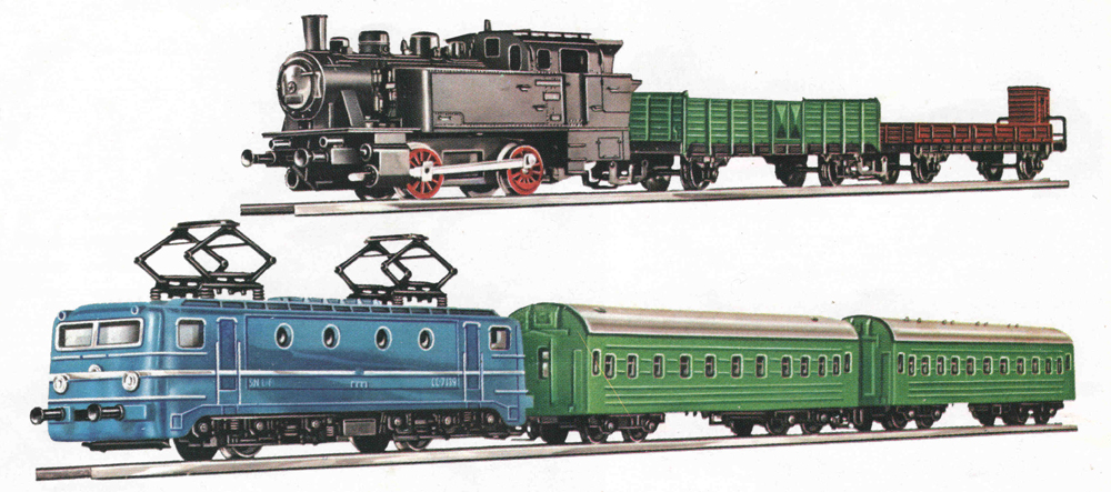 | dvojitý set parní lokomotivy s osobním vlakem a elektrické lokomotivy s nákladním vlakem |