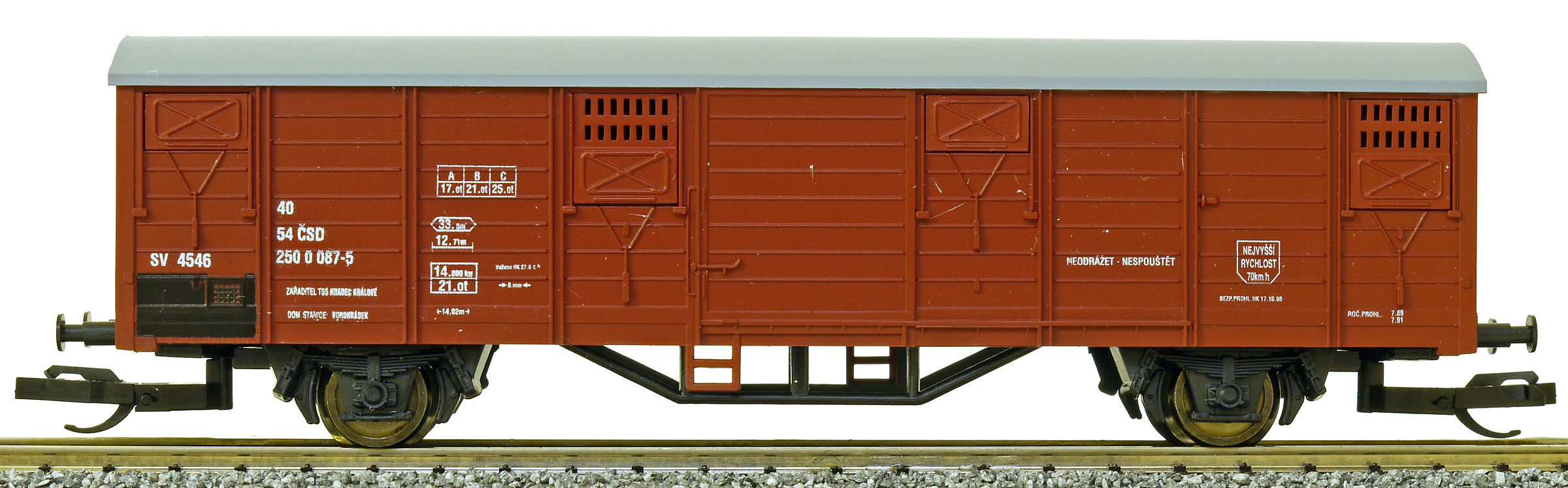 | krytý nákladní vůz červenohnědý s šedou střechou do pracovního vlaku |