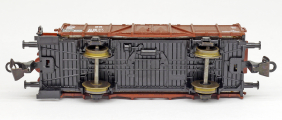 | otevřený nákladní vůz červenohnědý s brzdařskou budkou a plachtou |