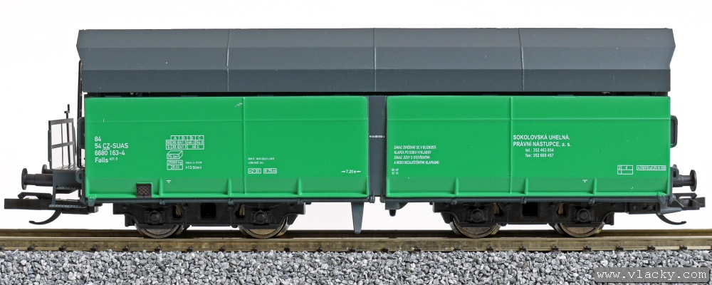 | nákladní samovýsypný vůz černý se zelenými klapkami „Sokolovská Uhelná a.s.“ |