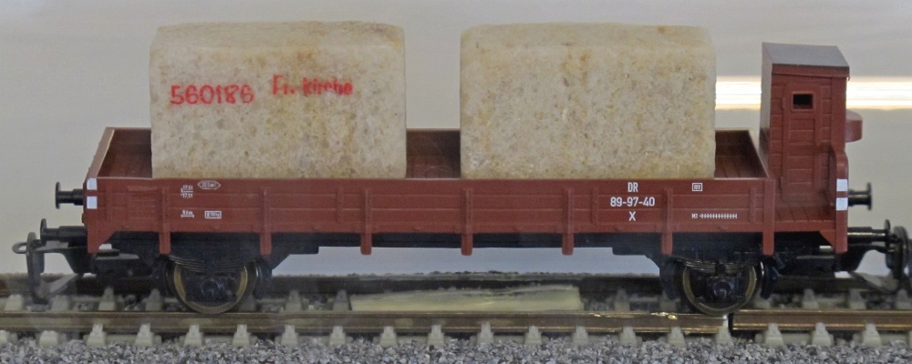 | nízkostěnný nákladní vůz červenohnědý s brzdařskou budkou a nákladem žulových bloků |
