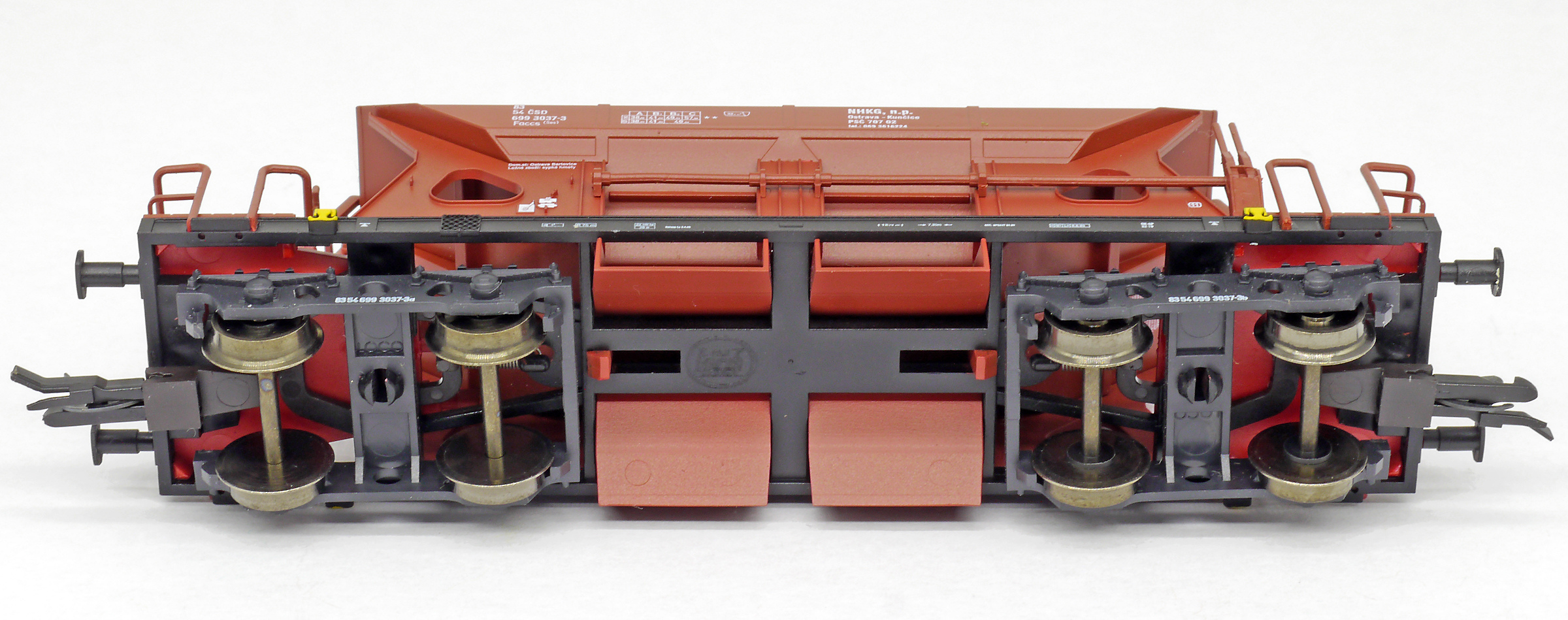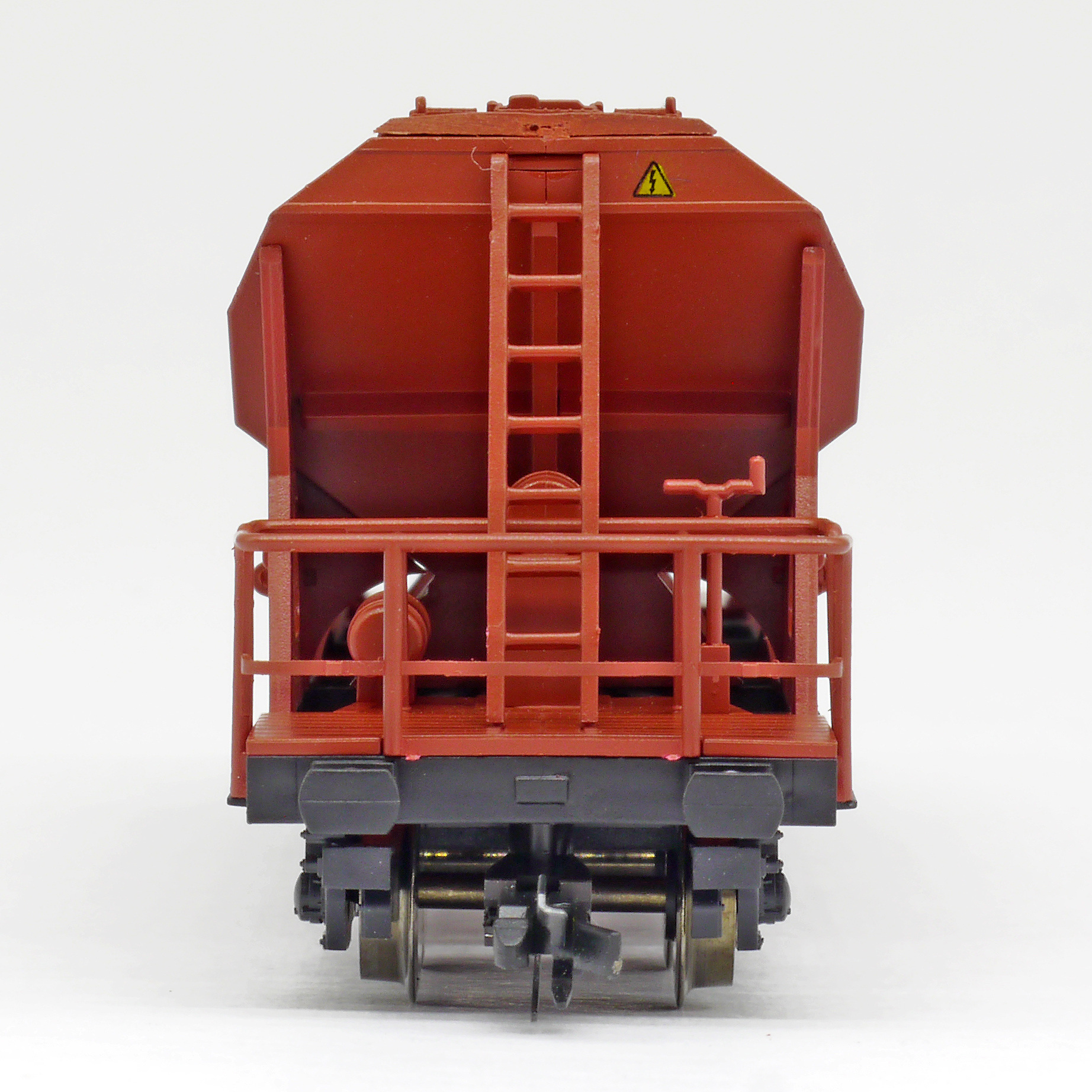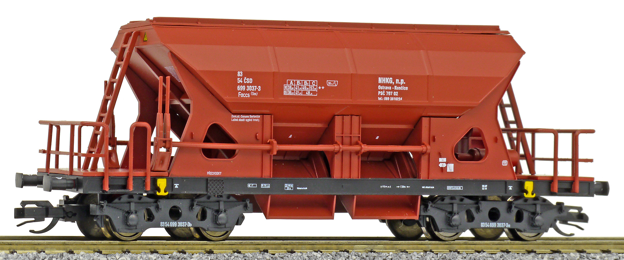 | nákladní samovýsypný vůz červenohnědý s černým rámem, s klapkami „NHKG Ostrava-Kunčice“ |