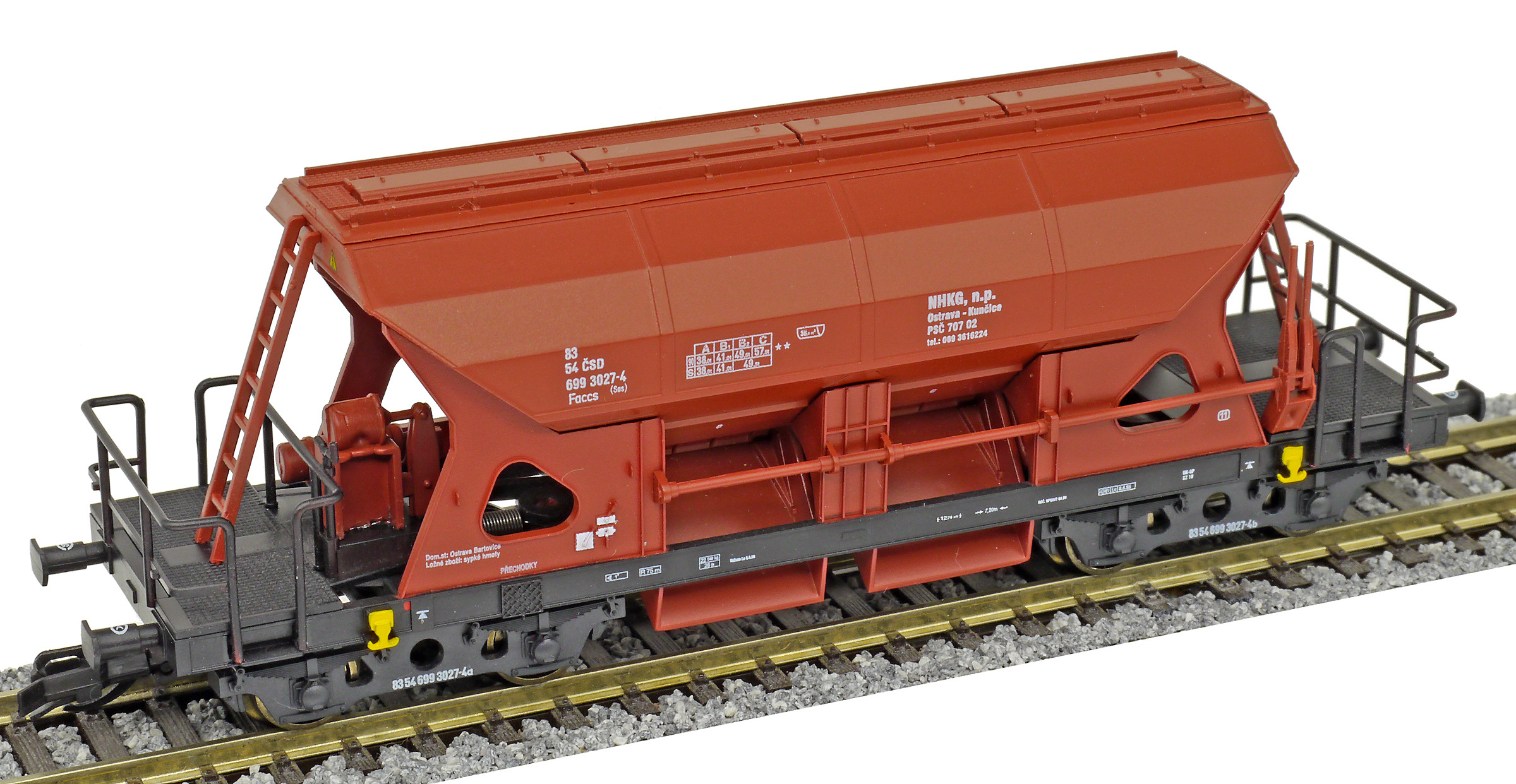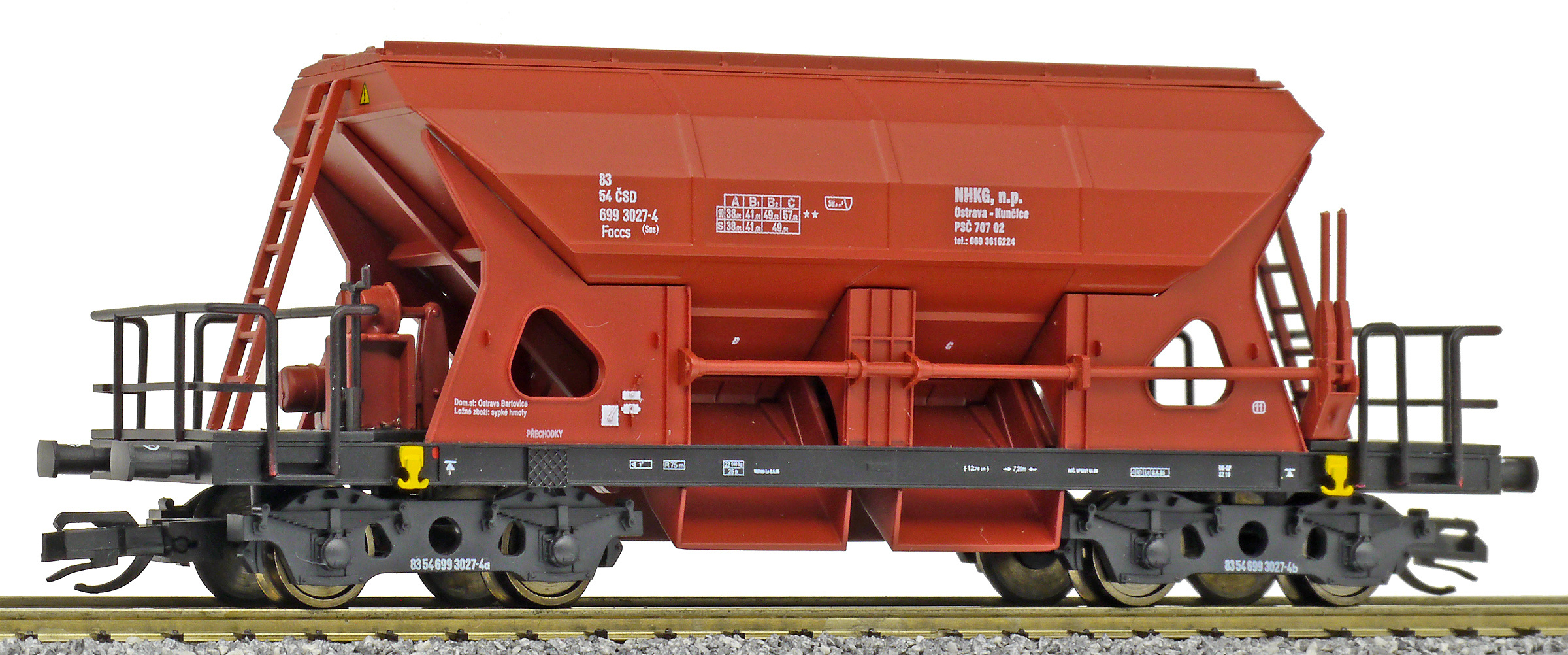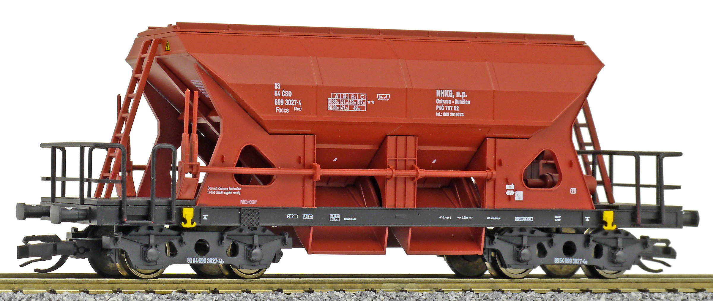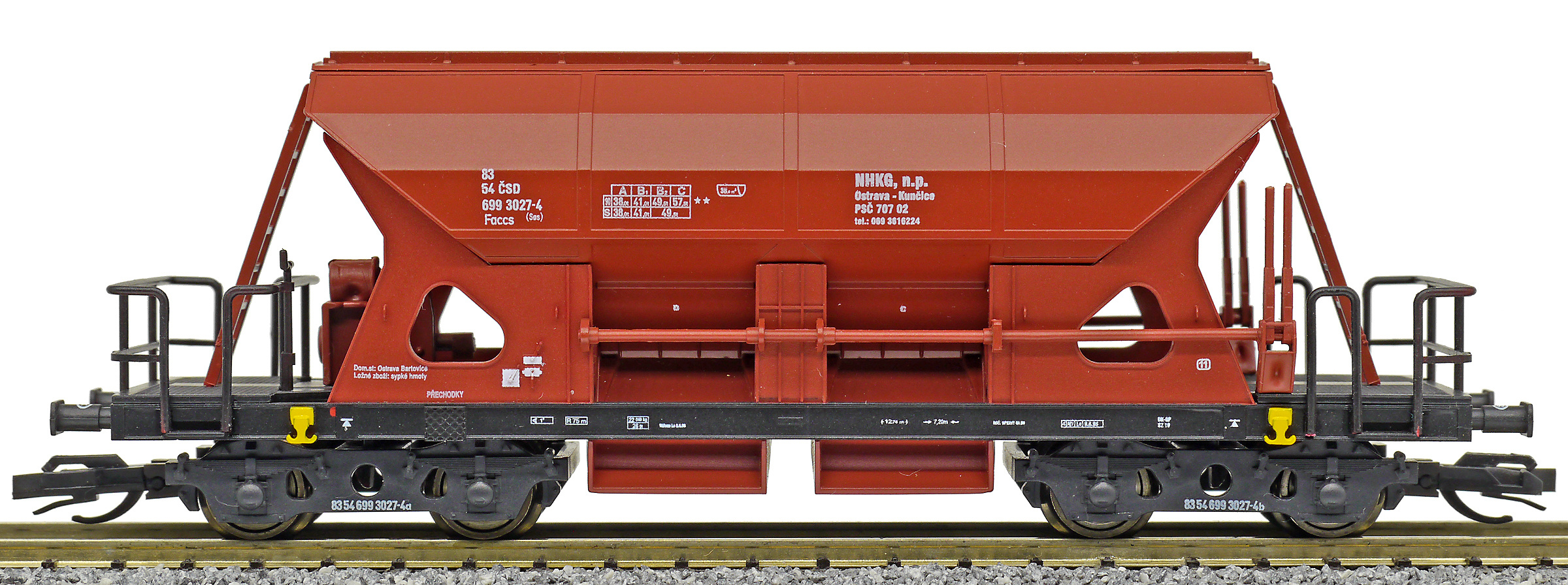 | nákladní samovýsypný vůz červenohnědý s černým rámem, s klapkami „NHKG Ostrava-Kunčice“ |