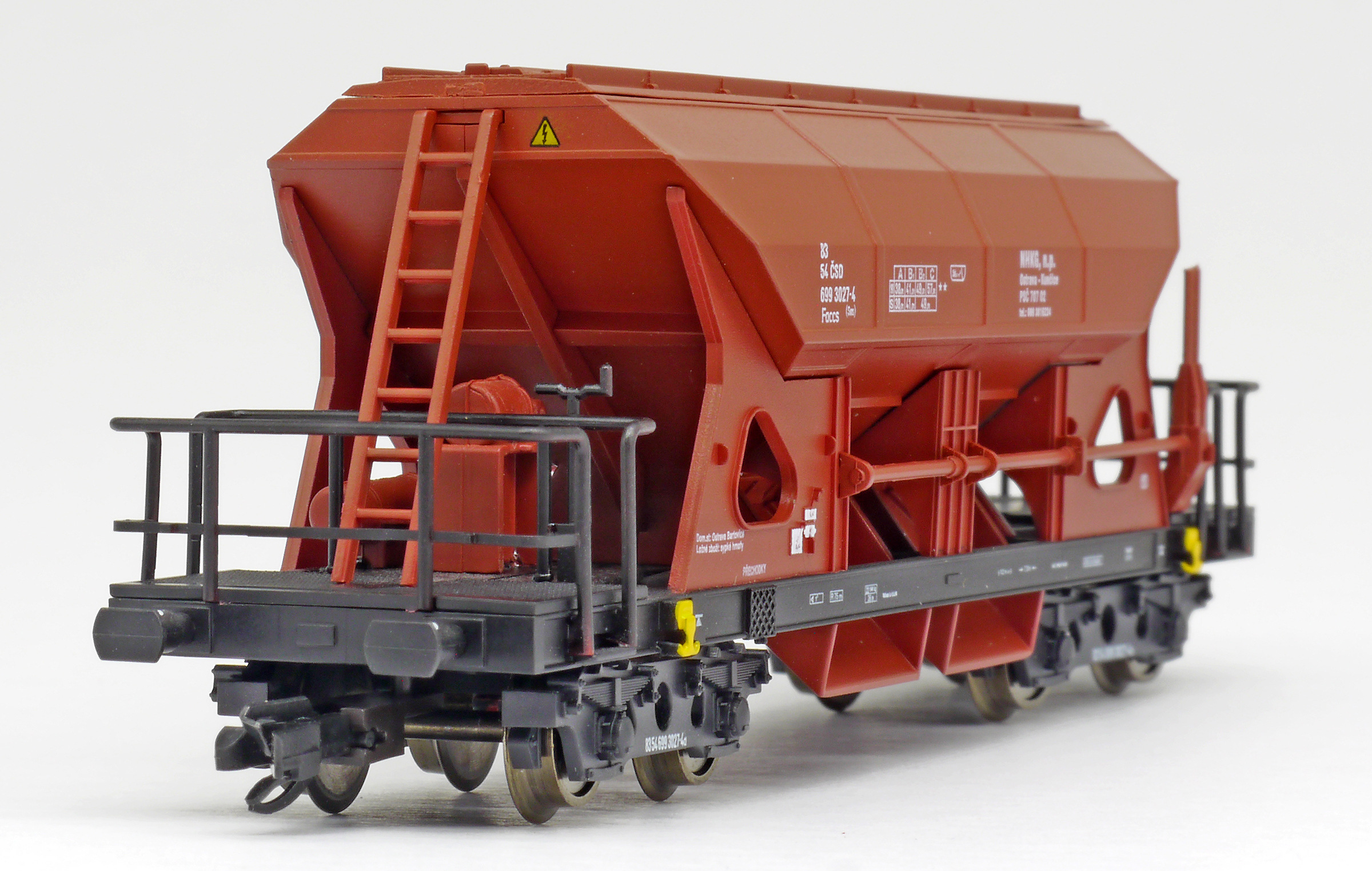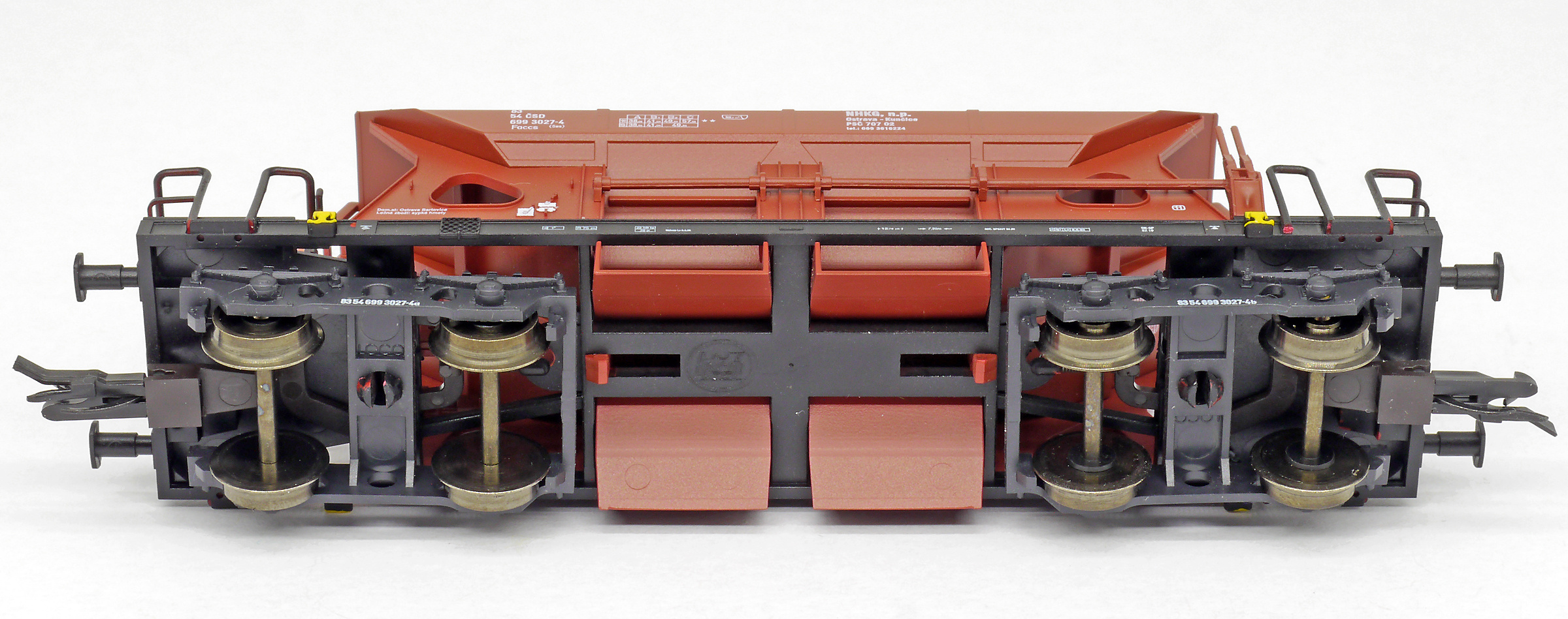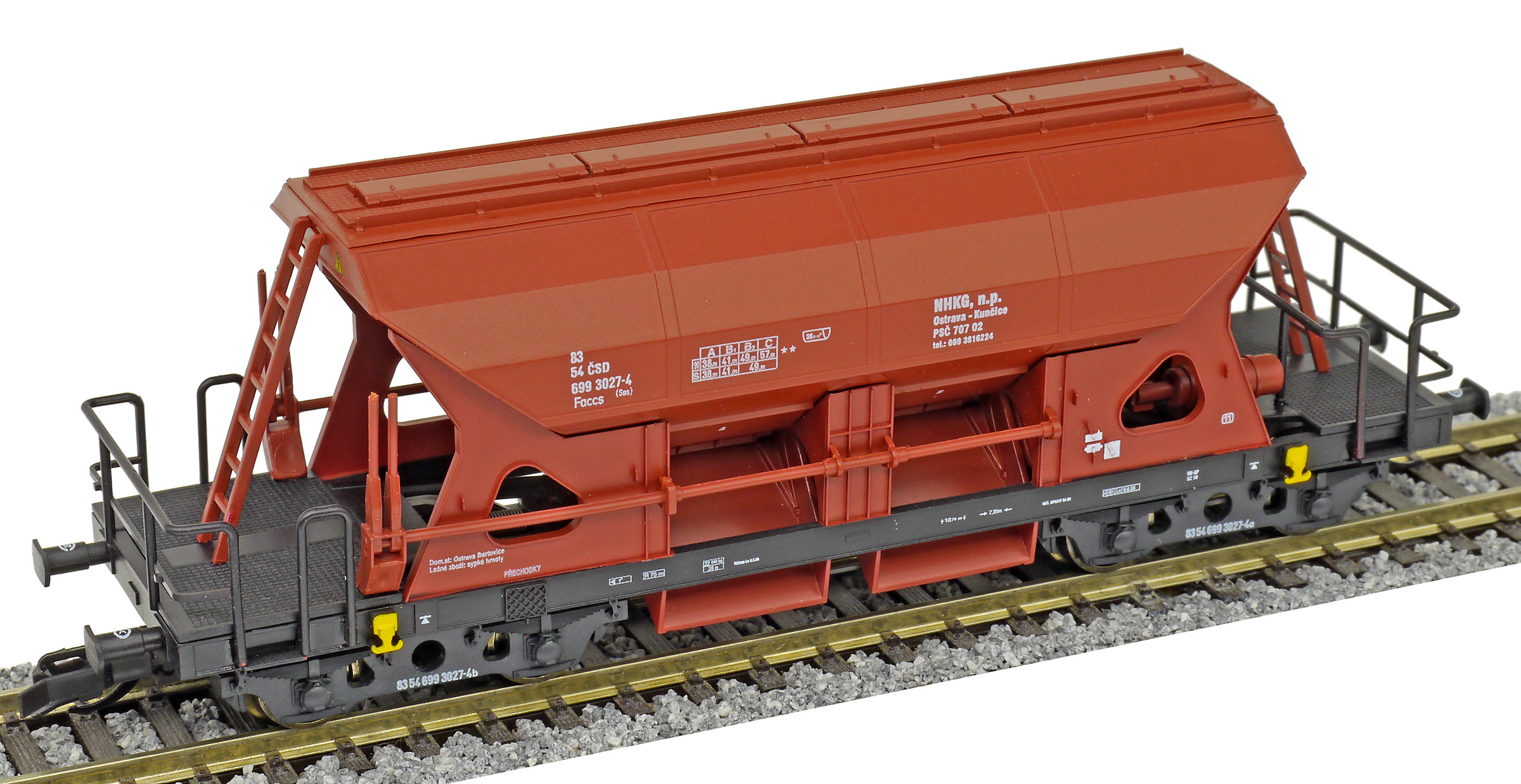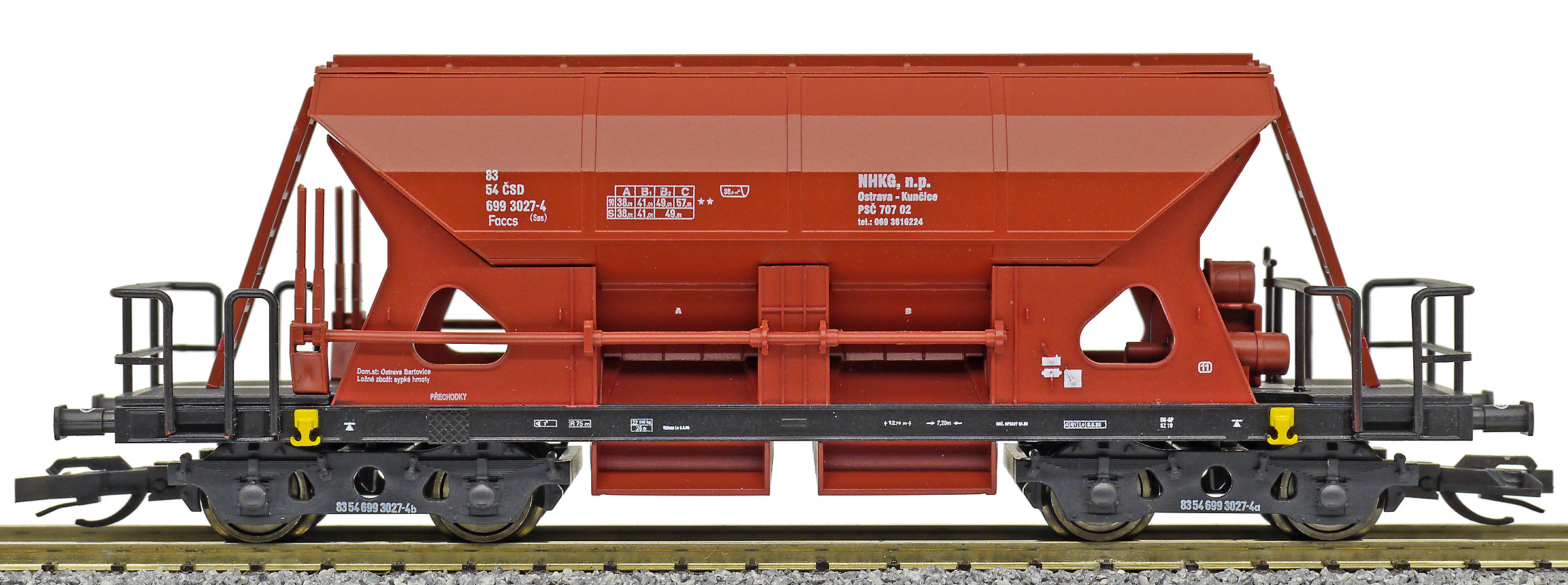 | nákladní samovýsypný vůz červenohnědý s černým rámem, s klapkami „NHKG Ostrava-Kunčice“ |