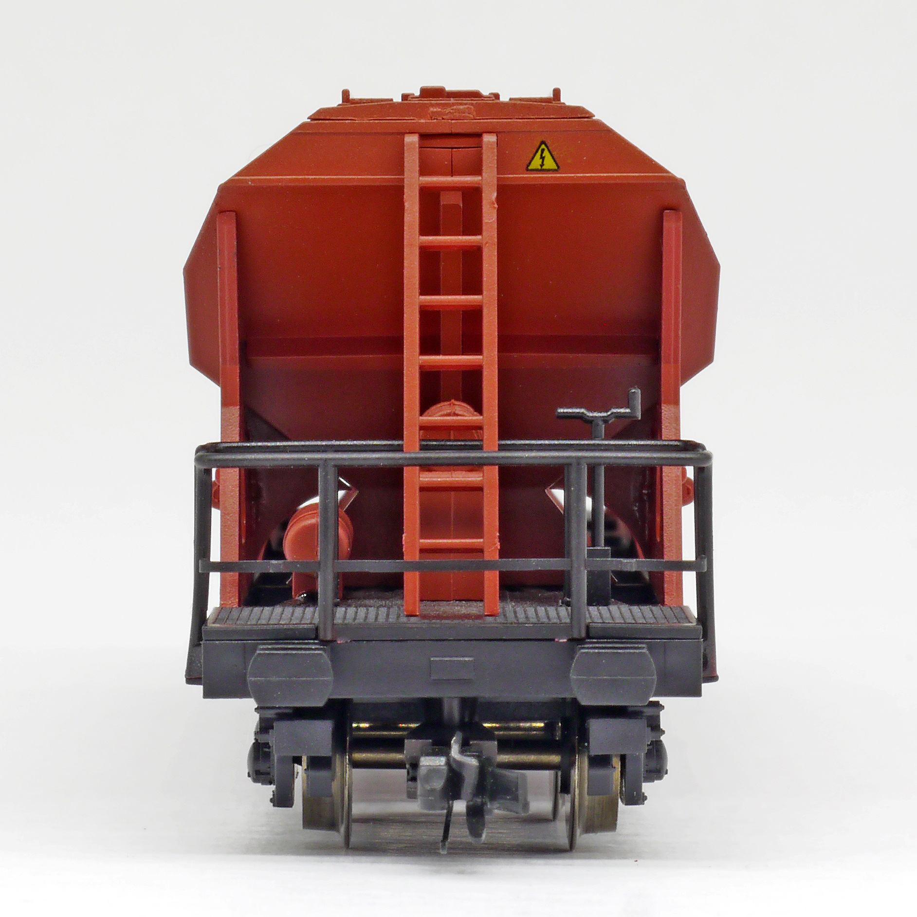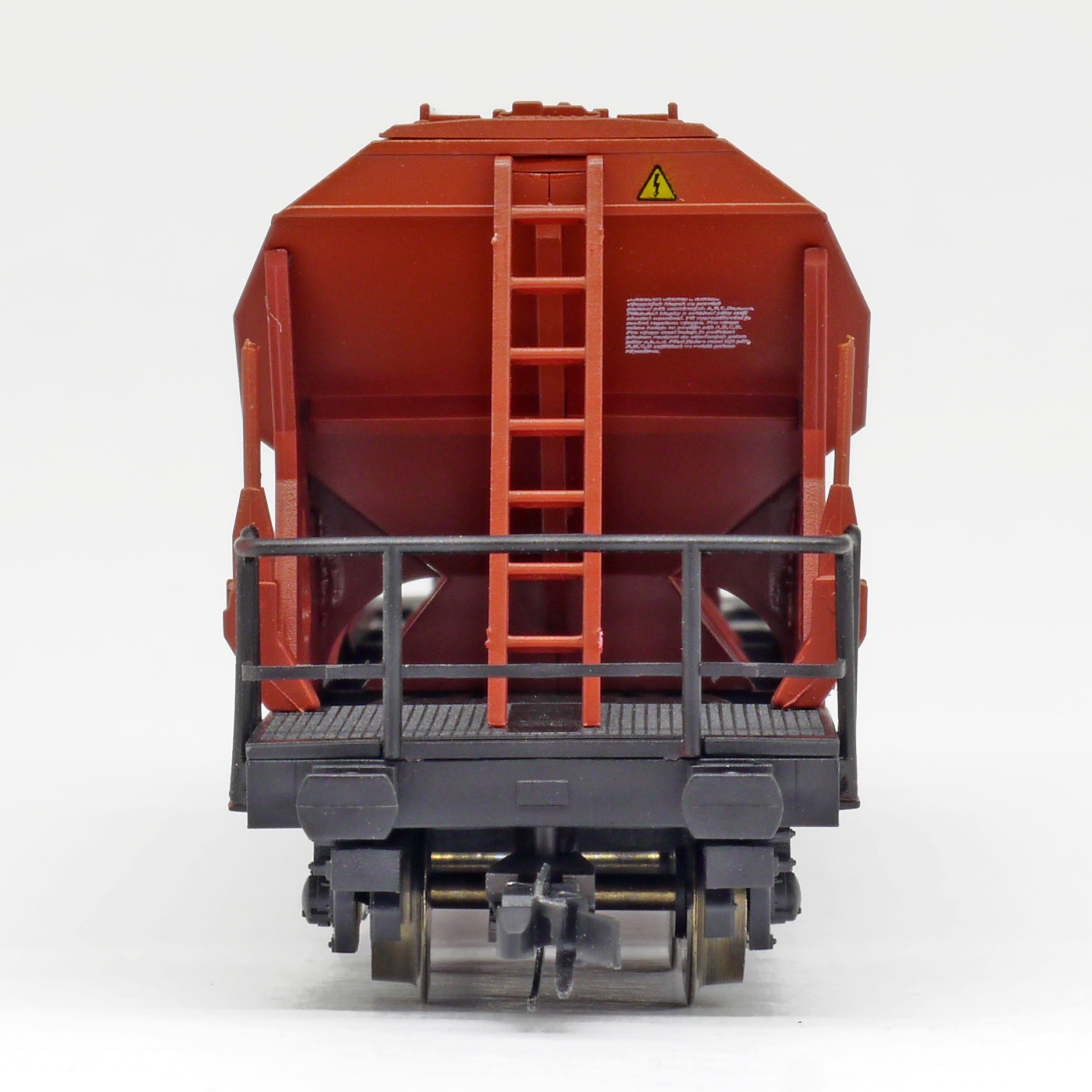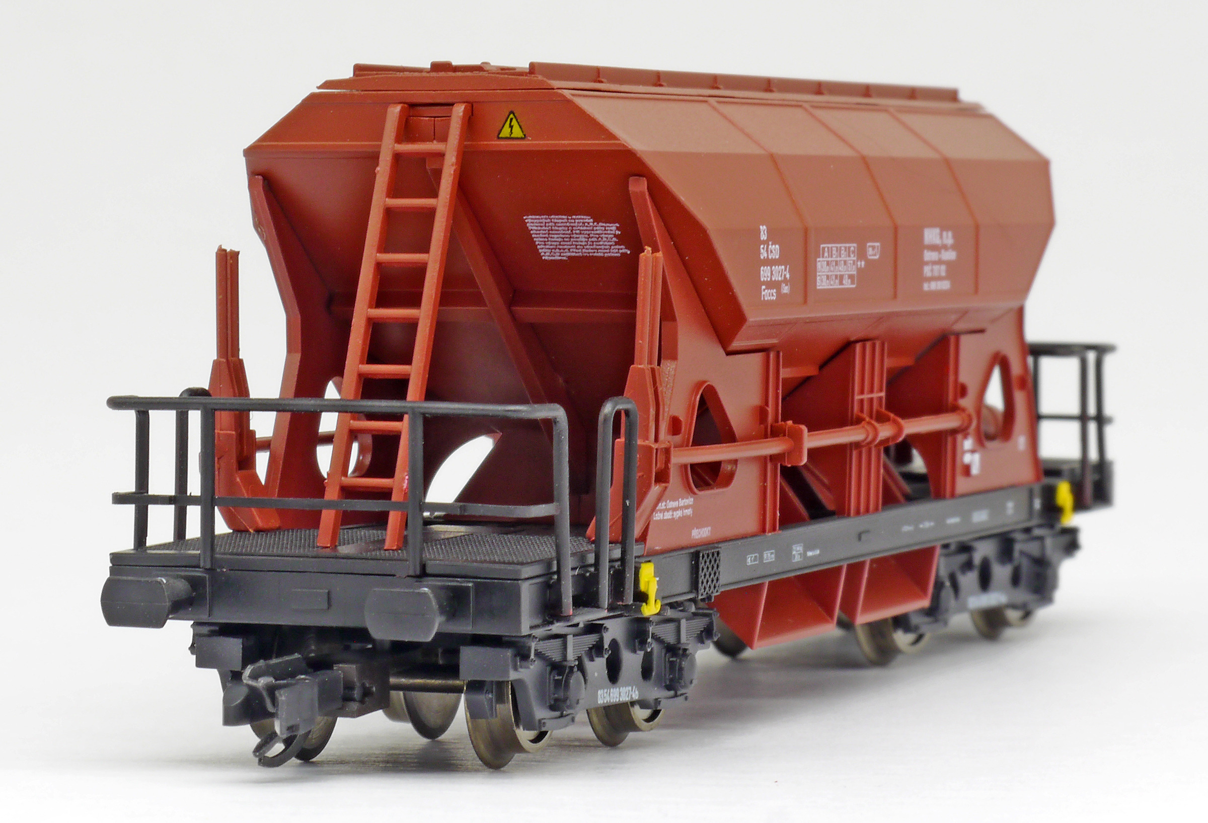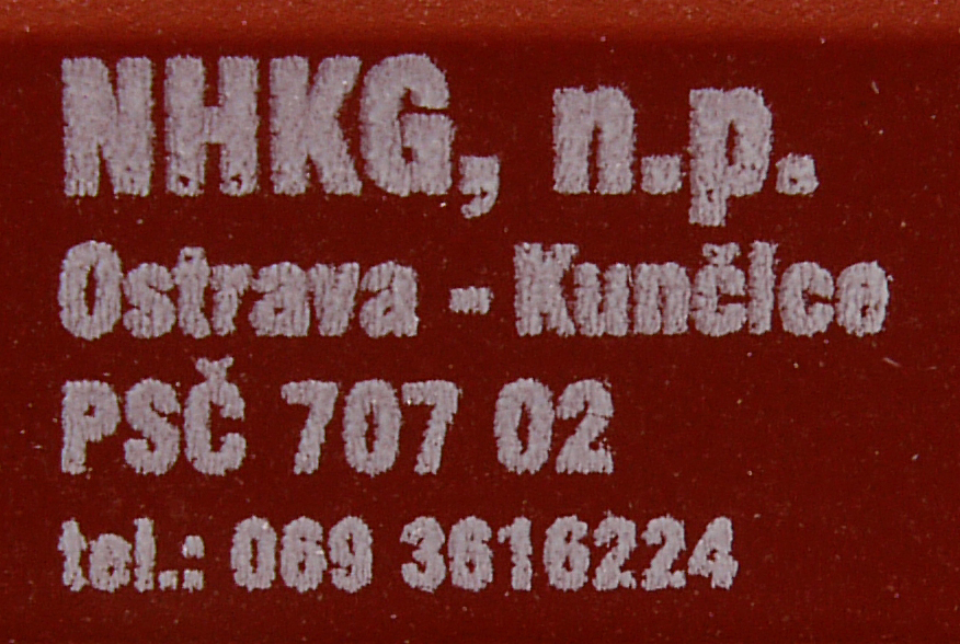 | nákladní samovýsypný vůz červenohnědý s černým rámem, s klapkami „NHKG Ostrava-Kunčice“ |
