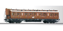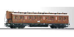 | oddílový osobní vůz červenohnědý se světle šedou střechou a brzdařskou budkou 3. tř. |