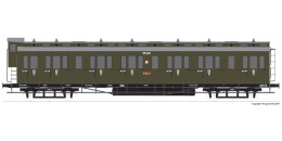 | oddílový osobní vůz zelený s šedou střechou a brzdařskou budkou 3. tř., st. Katowice |