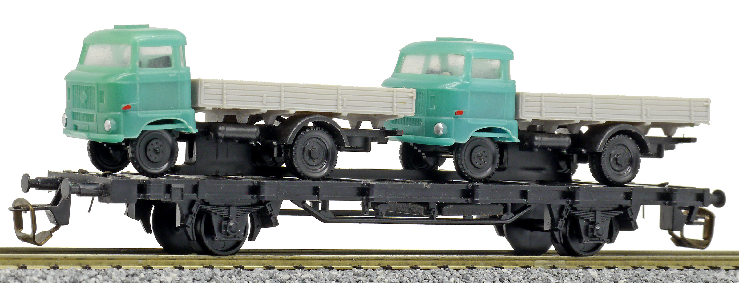 | plošinový vůz černý s nákladem dvou automobilů W50 |