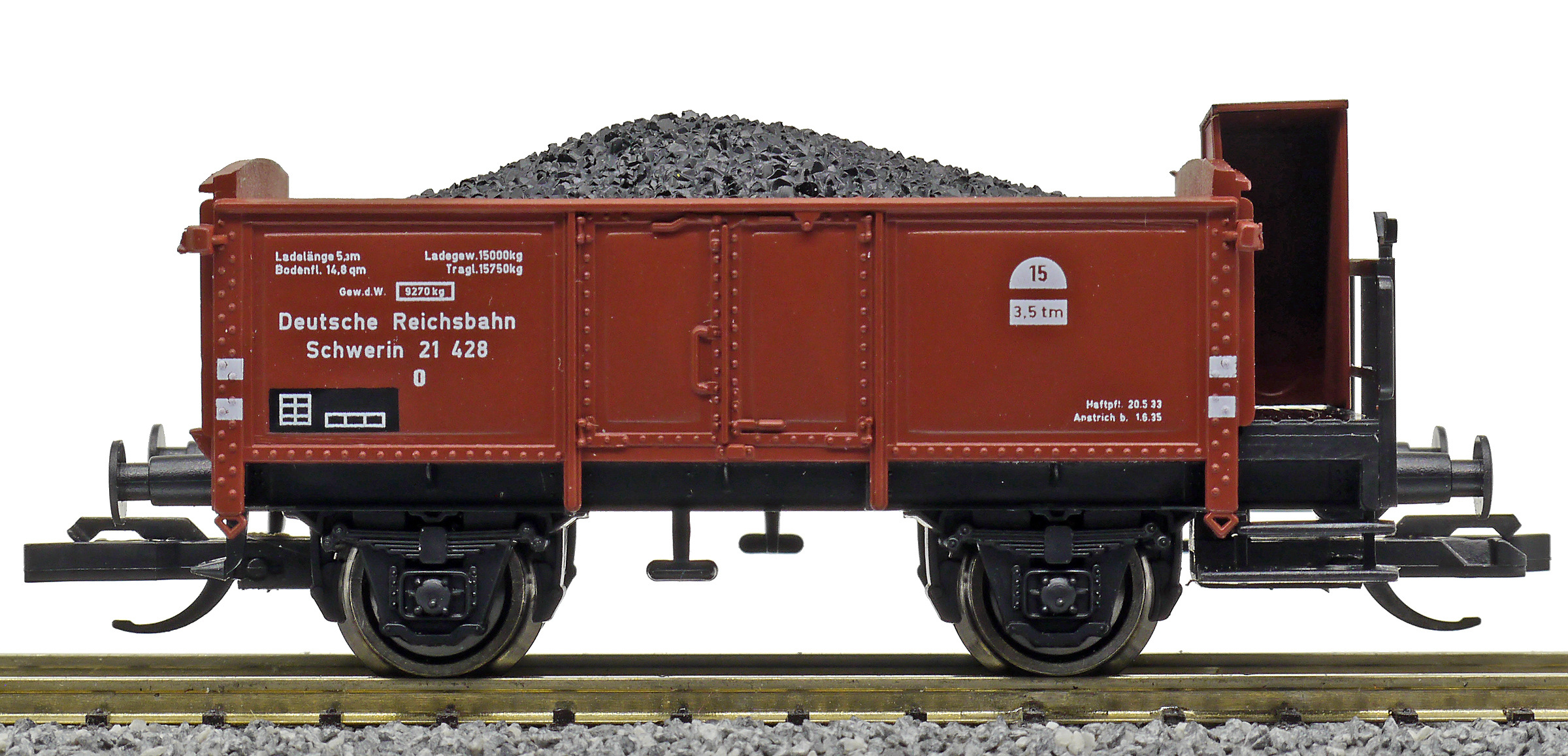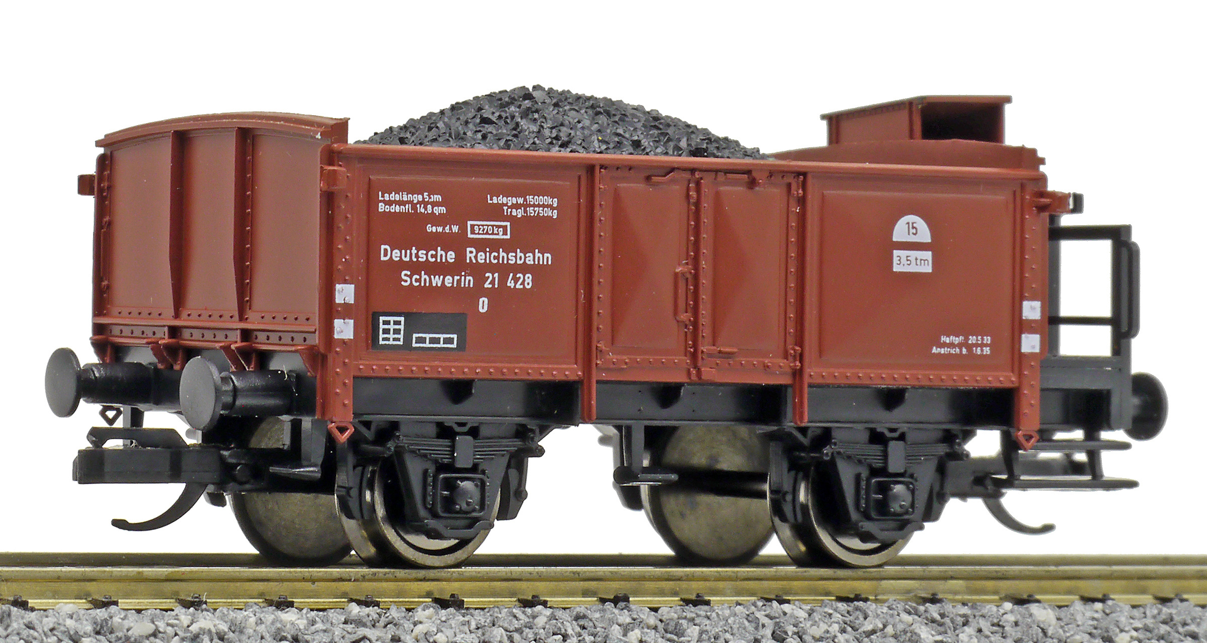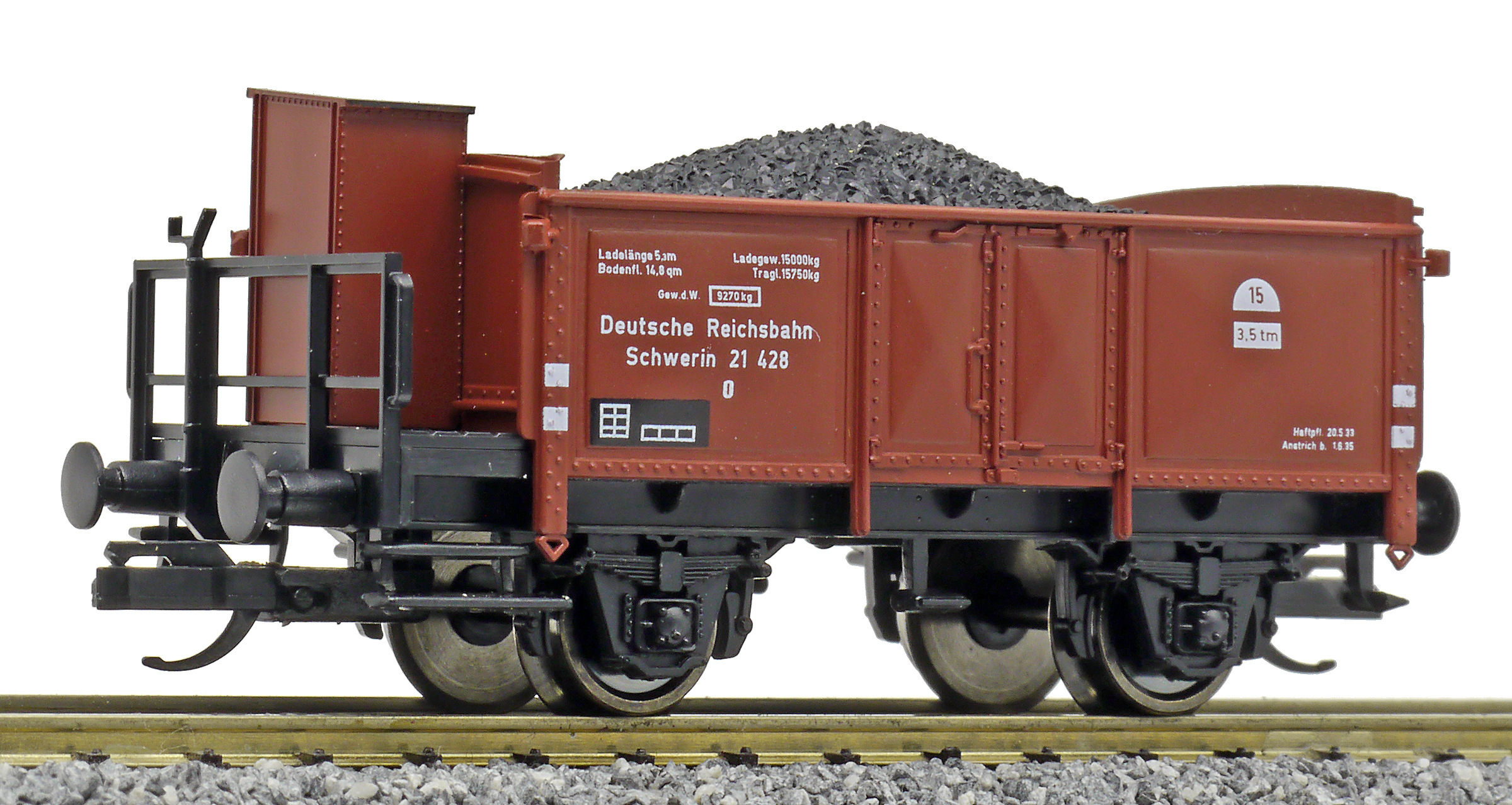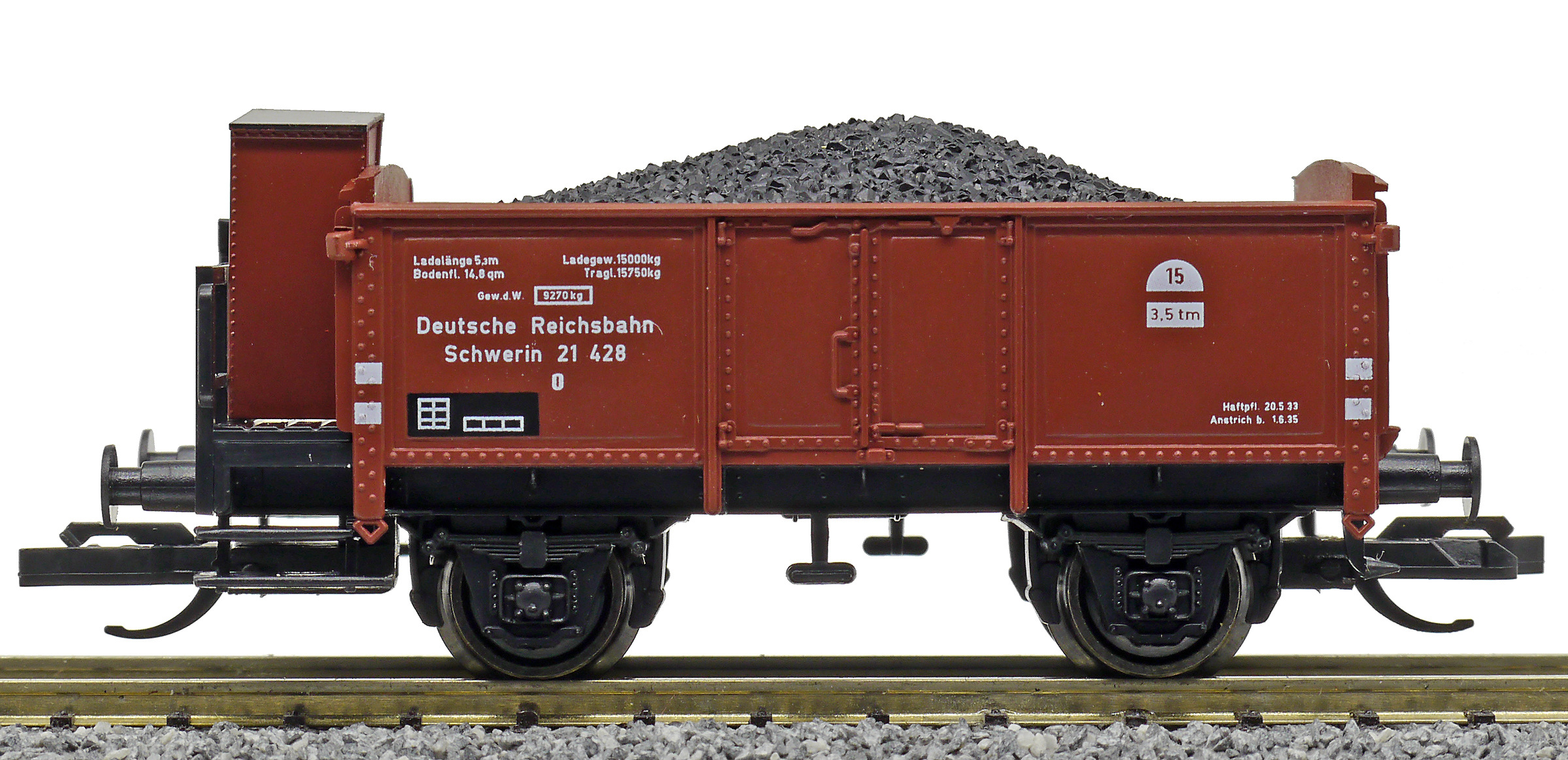 | otevřený nákladní vůz červenohnědý s brzdařskou budkou ložený uhlím |