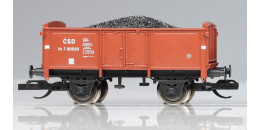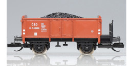| otevřený nákladní vůz červenohnědý s brzdařskou plošinou ložený uhlím |