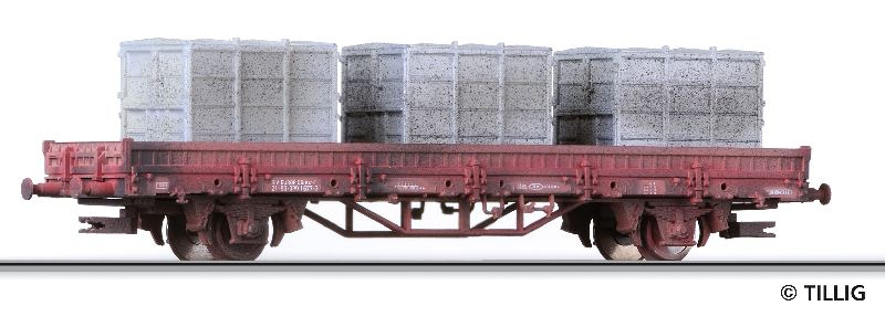 | nízkostěnný nákladní vůz červenohnědý patinovaný s nákladem tří kontejnerů |