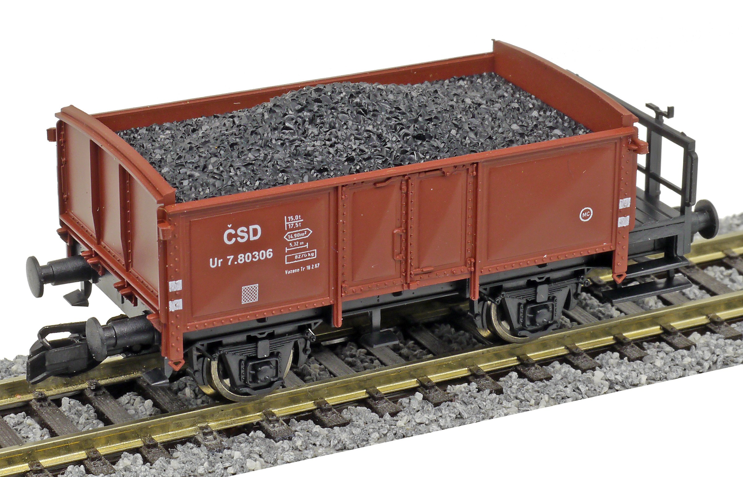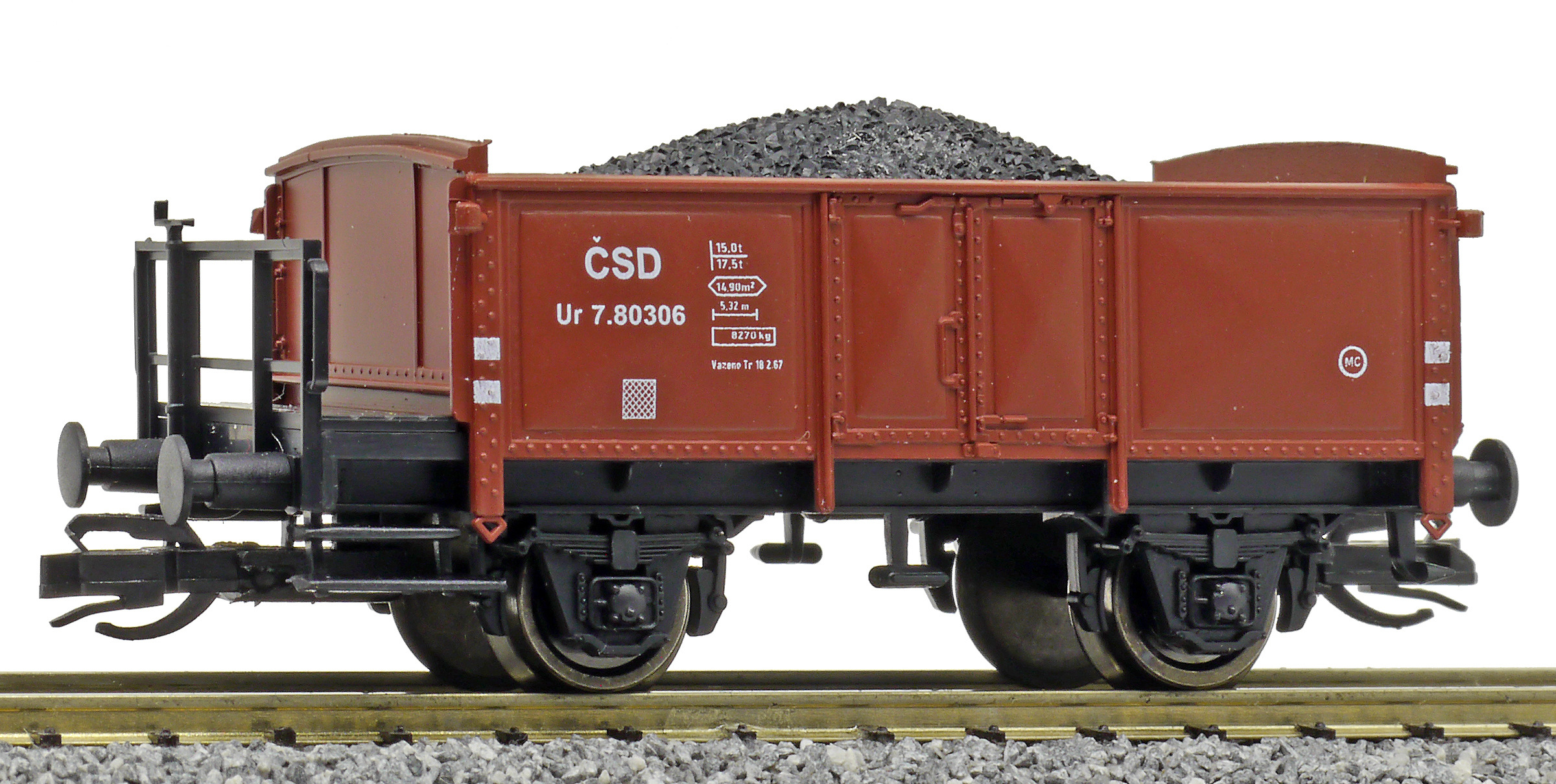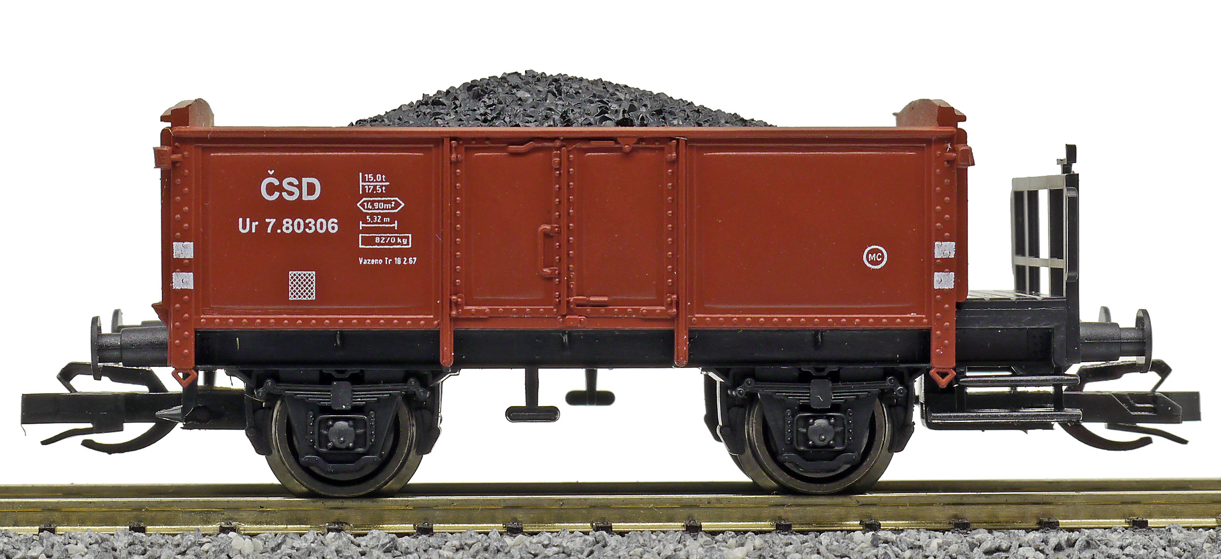 | otevřený nákladní vůz červenohnědý s brzdařskou plošinou ložený uhlím |