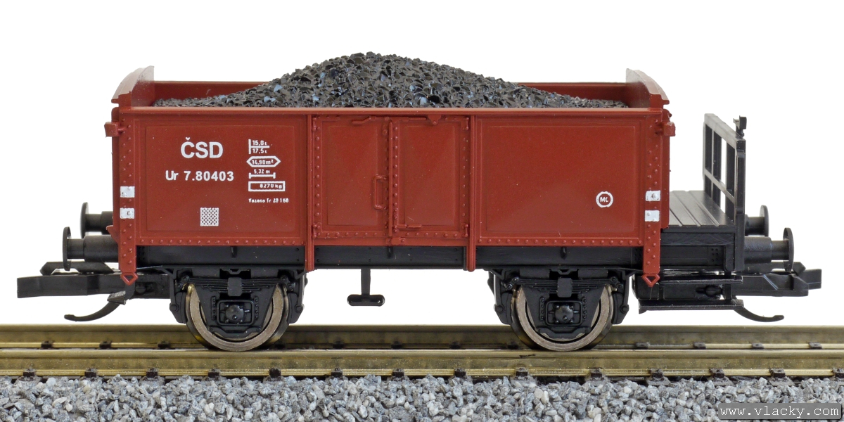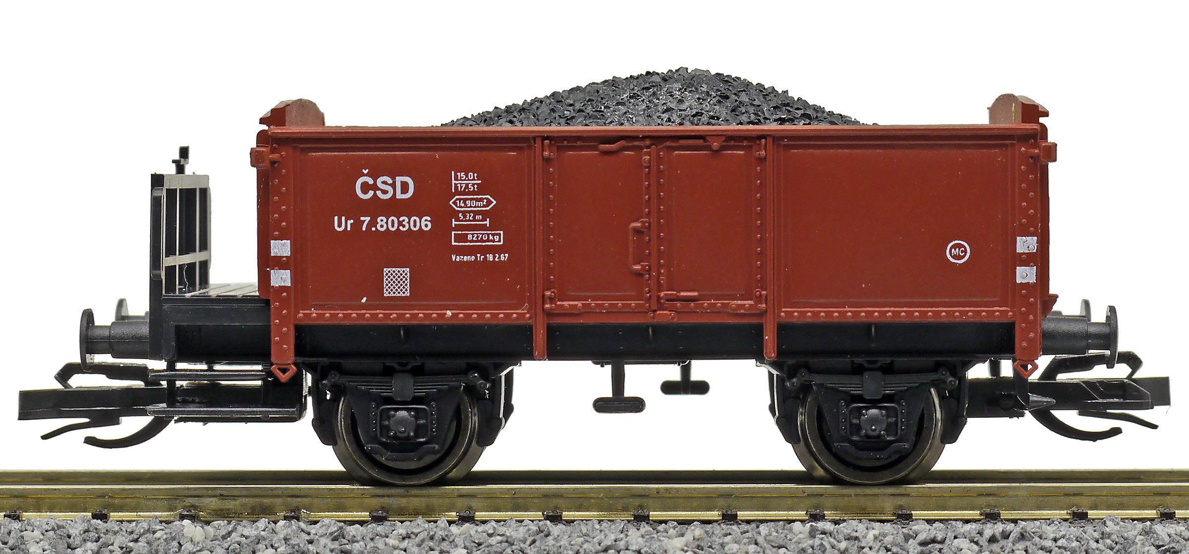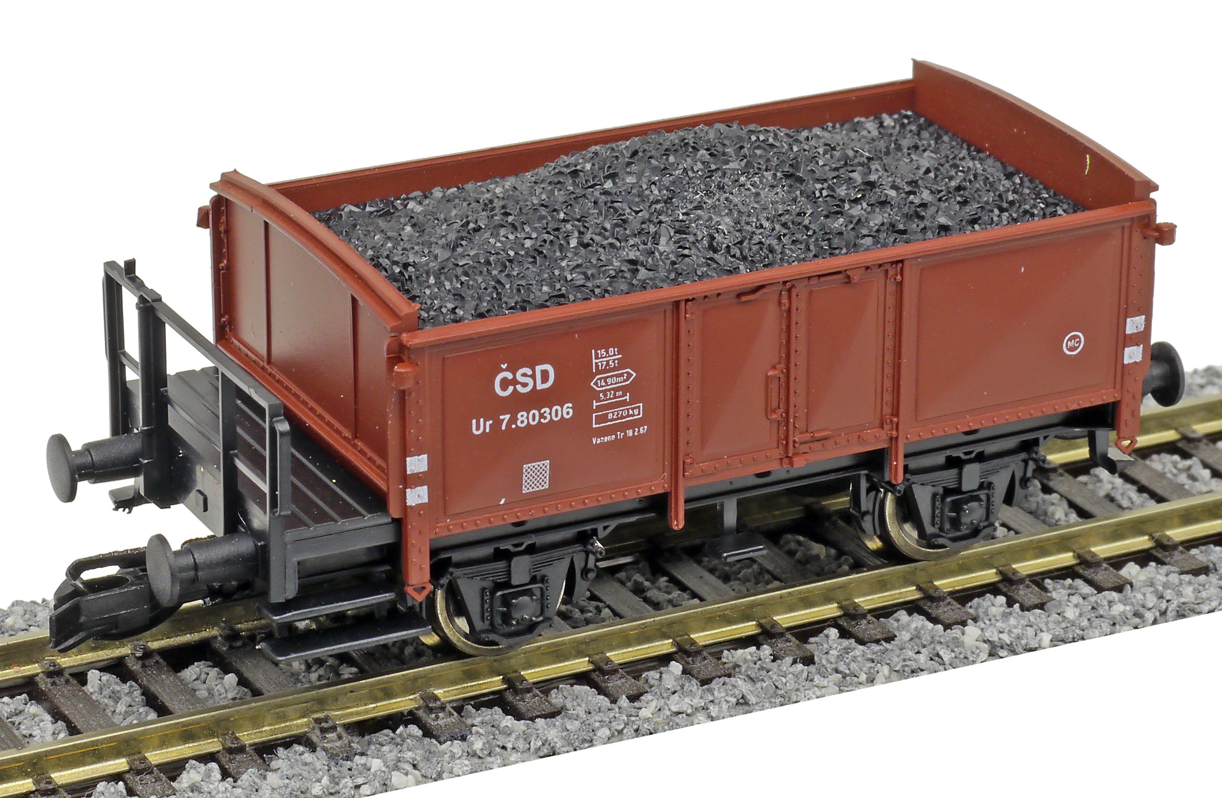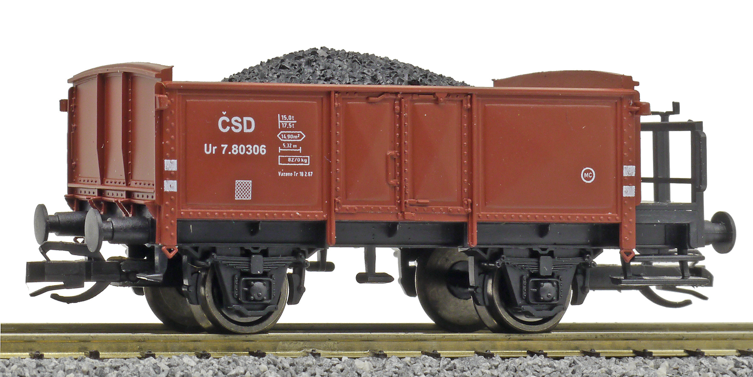 | otevřený nákladní vůz červenohnědý s brzdařskou plošinou ložený uhlím |