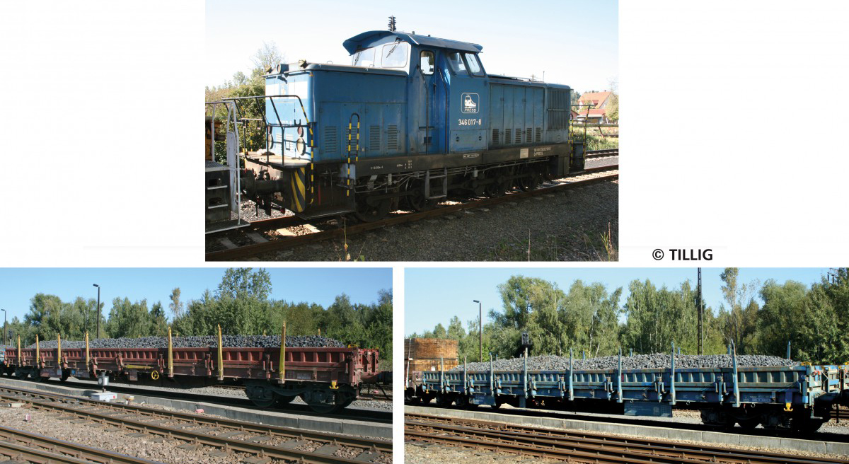 Popis   set lokomotivy BR 346 a dvou nízkostěnných vozů s nákladem štěrku „Pressni