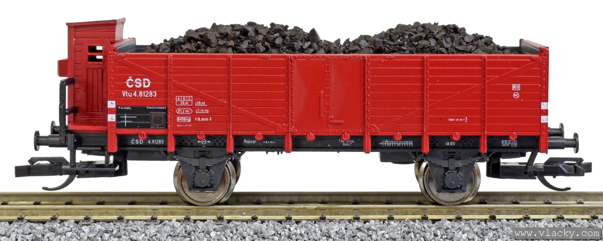 | otevřený nákladní vůz červenohnědý s brzdařskou budkou ložený uhlím |