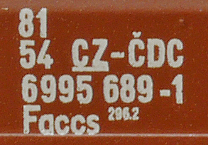 | • 81 54 6995 689-1 | → | nákladní, s podvozky, ve vlastnictví železniční správy, pro mezinárodní dopravu dle zvláštních umluv |