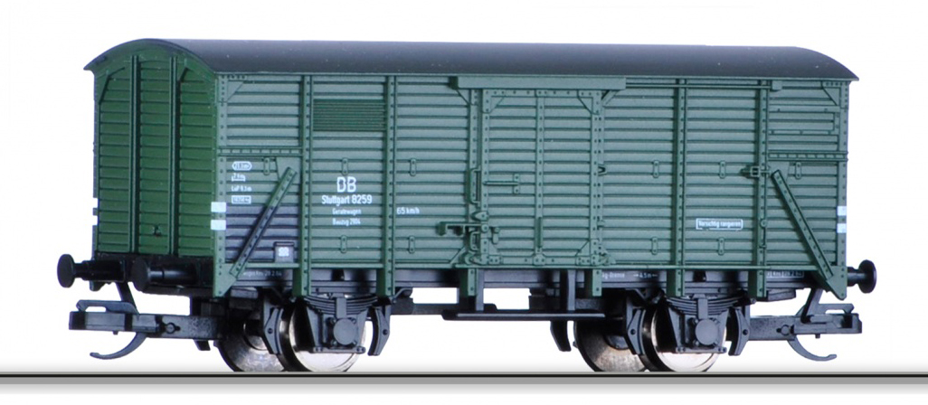 krytý nákladní vůz zelený s tmavě šedou střechou do stavebního vlaku „Bauzug“