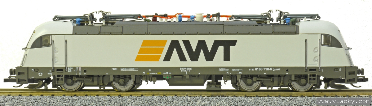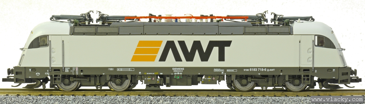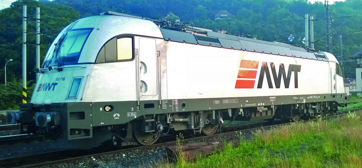 | elektrická lokomotiva světle šedá s černým rámem a pojezdem „AWT“ |