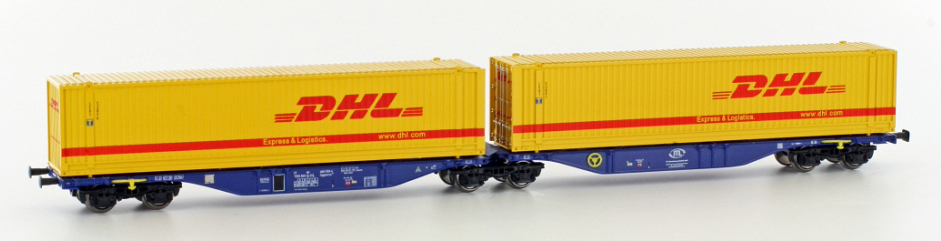 | dvoudílný kontejnerový vůz modrý se dvěma žlutými kontejnery 45' „DHL“ |