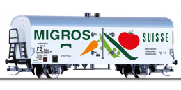 | bílý chladící vůz s šedou střechou „MIGROS“ |