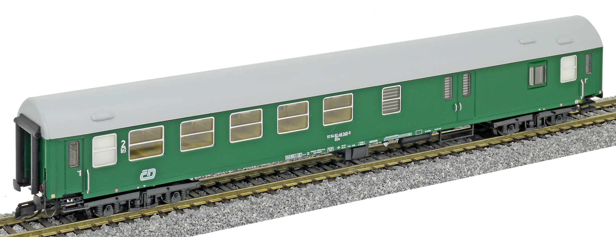 | rychlíkový vůz se služebním oddílem zelený s šedou střechou 2. tř. |