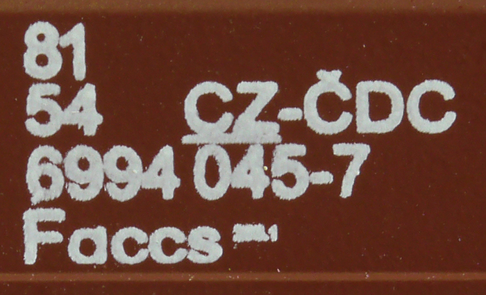| • 81 54 6994 045-7 | → | nákladní, s podvozky, ve vlastnictví železniční správy, pro mezinárodní dopravu dle zvláštních umluv |