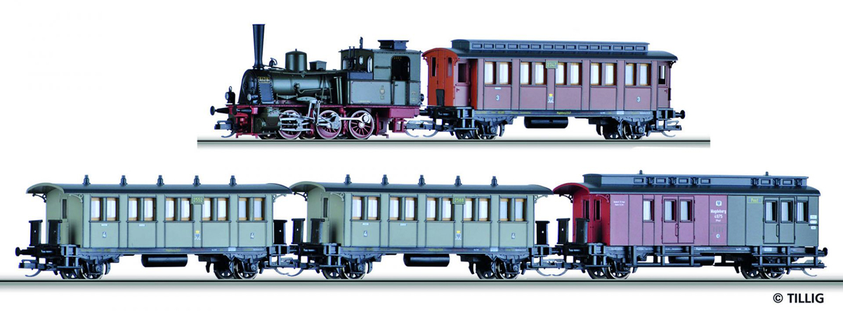 | set parní lokomotivy T3 a čtyř osobních vozů |