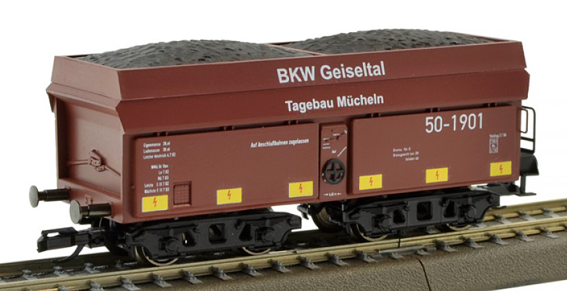 | samovýsypný vůz červenohnědý s nákladem uhlí |
