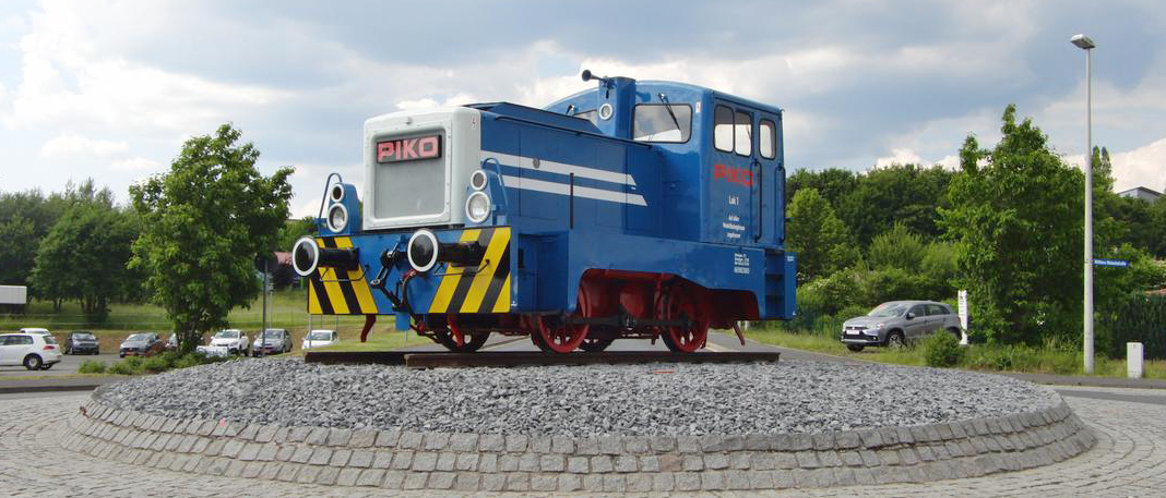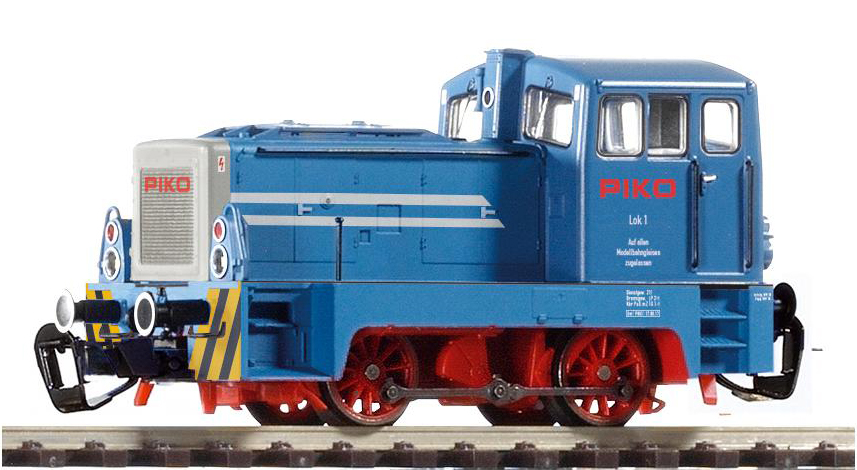| dieselová lokomotiva modrá s červeným pojezdem a reklamním potiskem „PIKO“ |