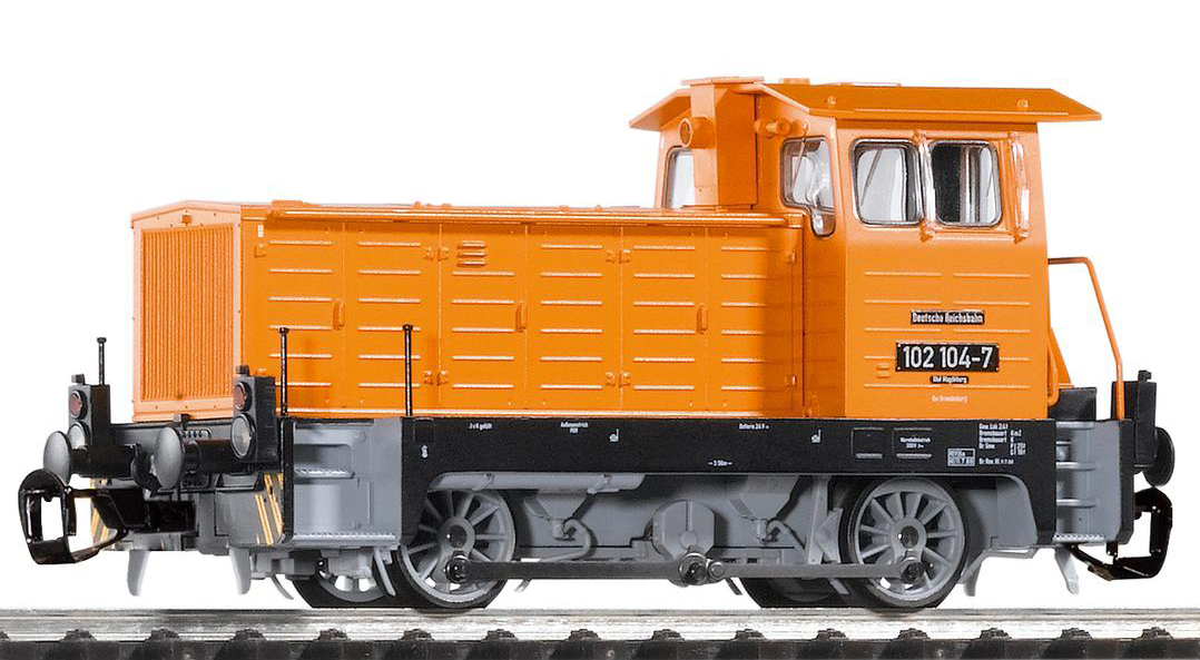 | dieselová lokomotiva oranžová s černým rámem a šedým pojezdem |